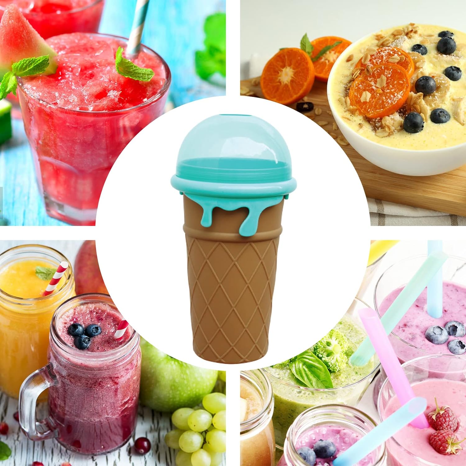 🍨【Безпечний матеріал】Чашка для смузі виготовлена ​​з харчового силікону, ТПУ та ПП, який не деформується та не пошкоджується, і має тривалий термін служби. Чашка щільно закривається і нелегко протікає. Можна прати та використовувати повторно. Просто вимийте кухоль водою (примітка: не можна прати в пральній машині!) і знову заморозьте, щоб брати з собою в холодні дні. Ідеально підходить для дітей і дорослих.