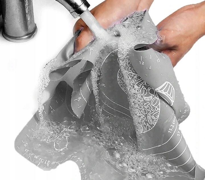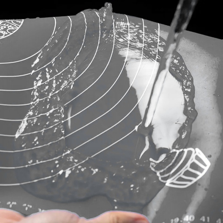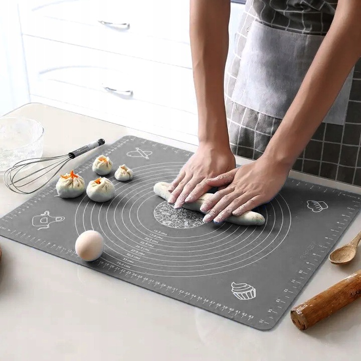 Практична силіконова дошка - незамінний аксесуар на кожній кухні. Велика поверхня 50 × 70 см із вбудованою мірною чашкою та маркуванням полегшує розкачування тіста, формування вареників, піци, пасти чи печива. Виготовлений з товстого, еластичного харчового силікону, він ідеально прилягає до стільниці, не рухається і захищає робочу поверхню від забруднення.