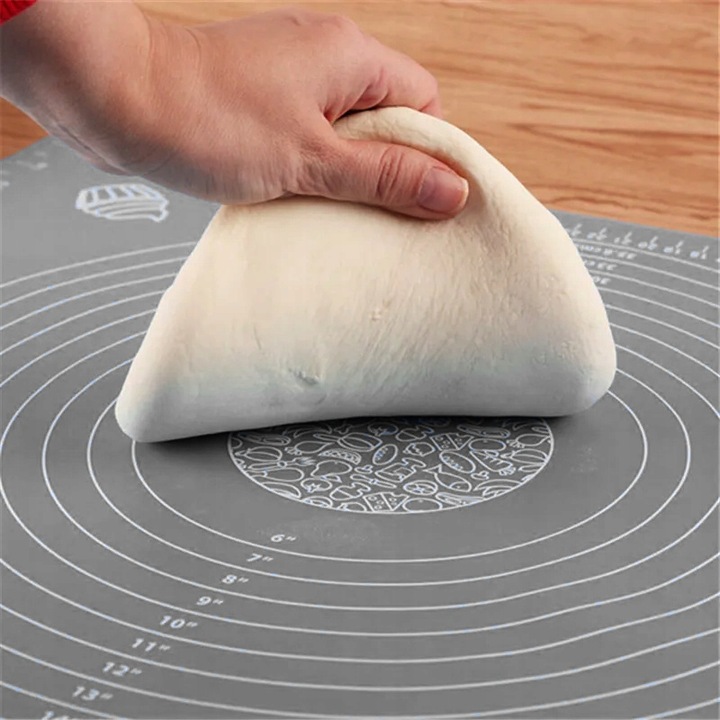 - Нековзна поверхня килимка міцно тримається на стільниці та не потребує присипання борошном.