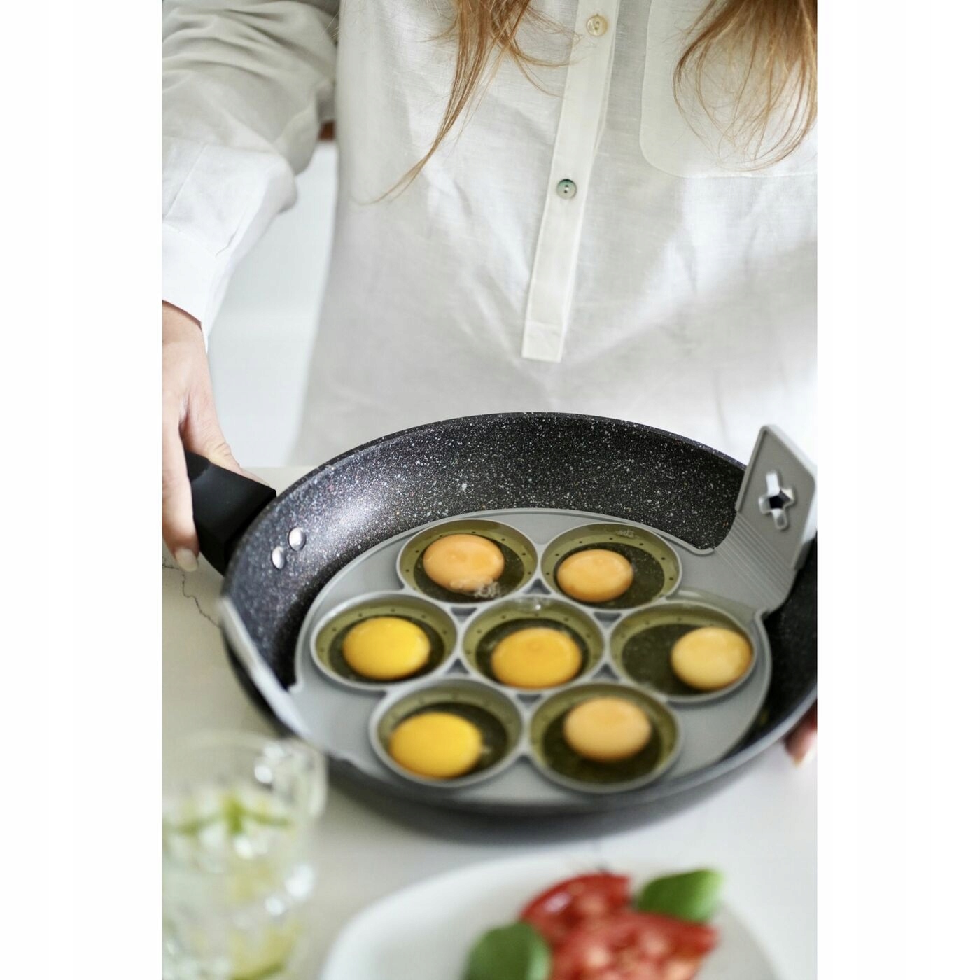 Силіконова форма для млинців і яєчні Tadar Silico 40 х 23 х 1,5 см сірого кольору допоможе приготувати цілих сім ідеально рівних круглих млинців або яєць. Завдяки довгим ручкам ви отримаєте повну безпеку і комфорт використання під час смаження. Міцний і стійкий силікон буде користуватися роками. Його антипригарну поверхню легко чистити. Підходить для посудомийної машини.