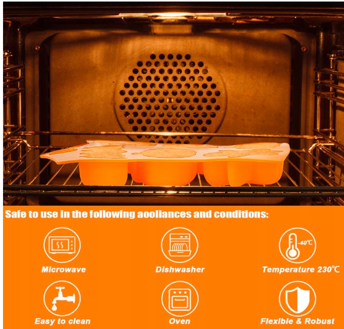 - Безпечний матеріал. Силіконова форма для випікання на Хеллоуїн виготовлена з харчового органічного силікону, який є м’яким, не липким, безпечним, не містить добавок, його легко чистити та знімати.