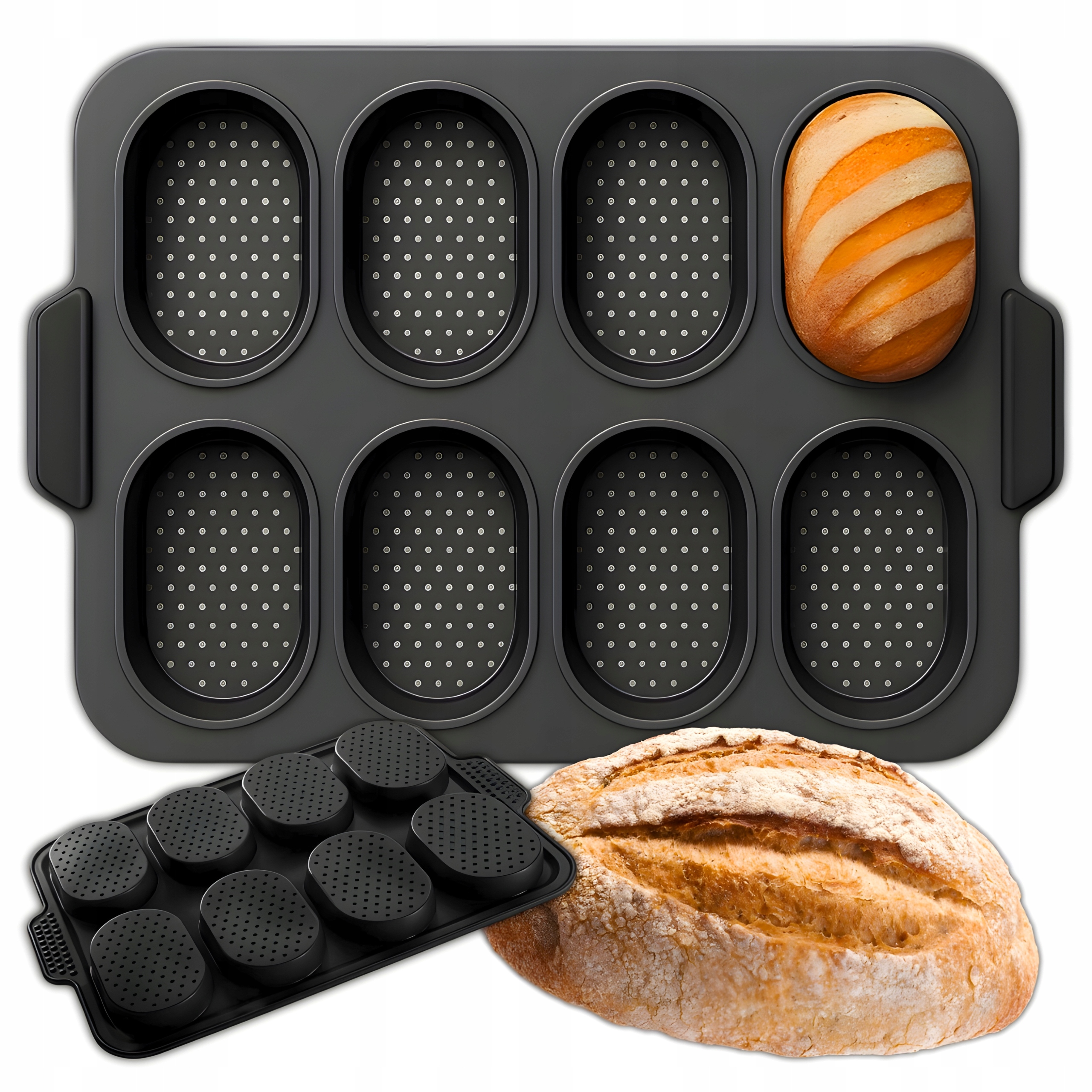 ✳ Практична форма з 8 овальними порожнинами , що дозволяє випікати ідеально рівномірно і хрусткі булочки в домашній духовці. Виготовлений з високоякісного антипригарного силікону , це гарантує легке видалення випічки та швидкого очищення. перфороване дно забезпечує оптимальну циркуляцію гарячого повітря, що перетворюється на ідеально запечений хліб.