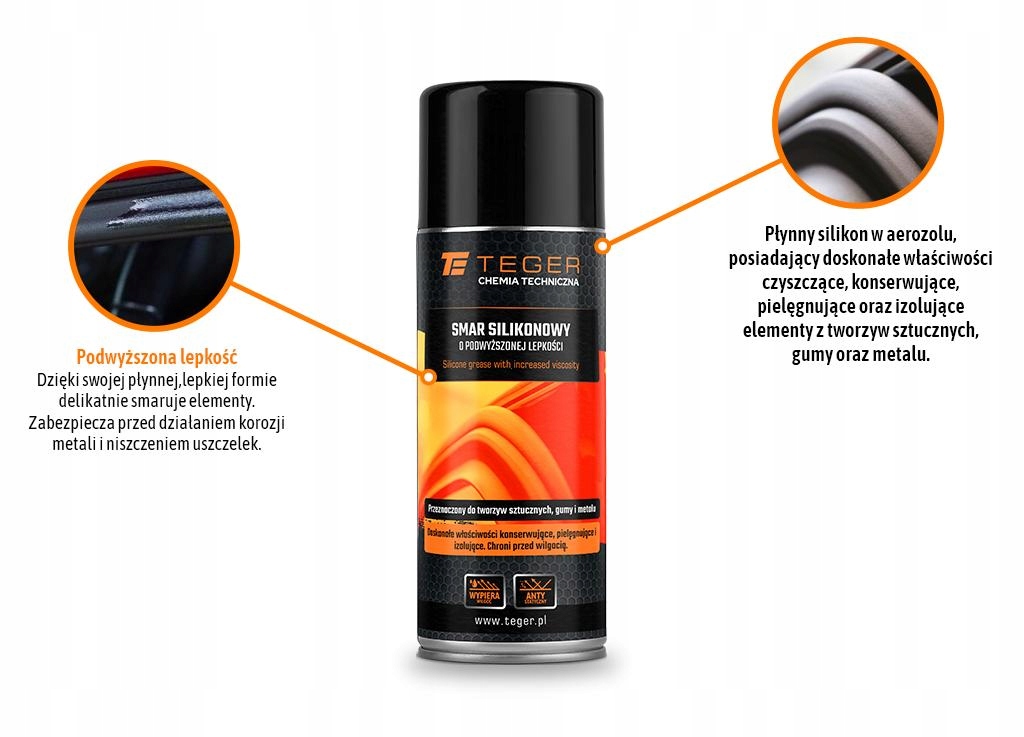Універсальна силіконова жира, ідеально підходить для металу, скла, кераміки та пластмас. Це створює тонке безбарвне покриття, що змащує усунення тертя. Підготовка має відмінні збереження та виховання властивостей. Це дає блиск готовим гумовим продуктами, це також запобігає подрібненню гуми. Завдяки сильним гідрофобним властивостям він захищає внутрішню частину замків від замерзання. Агент має антистатичні властивості і запобігає скрипку. Властивості • Універсальний засіб з тривалою операцією для обслуговування та захисту металевих та гумових виробів. • Водонепроникний, має антистатичні властивості, • має відмінні збереження та виховання властивостей • Ефективна при температурі: - від 60 до +200 ° C • Створює невидимий тонкий шар, який зменшує тертя, що запобігає скрипку. Перед використанням струсіть контейнер. Застосовуйте з відстані 20-30 см.
