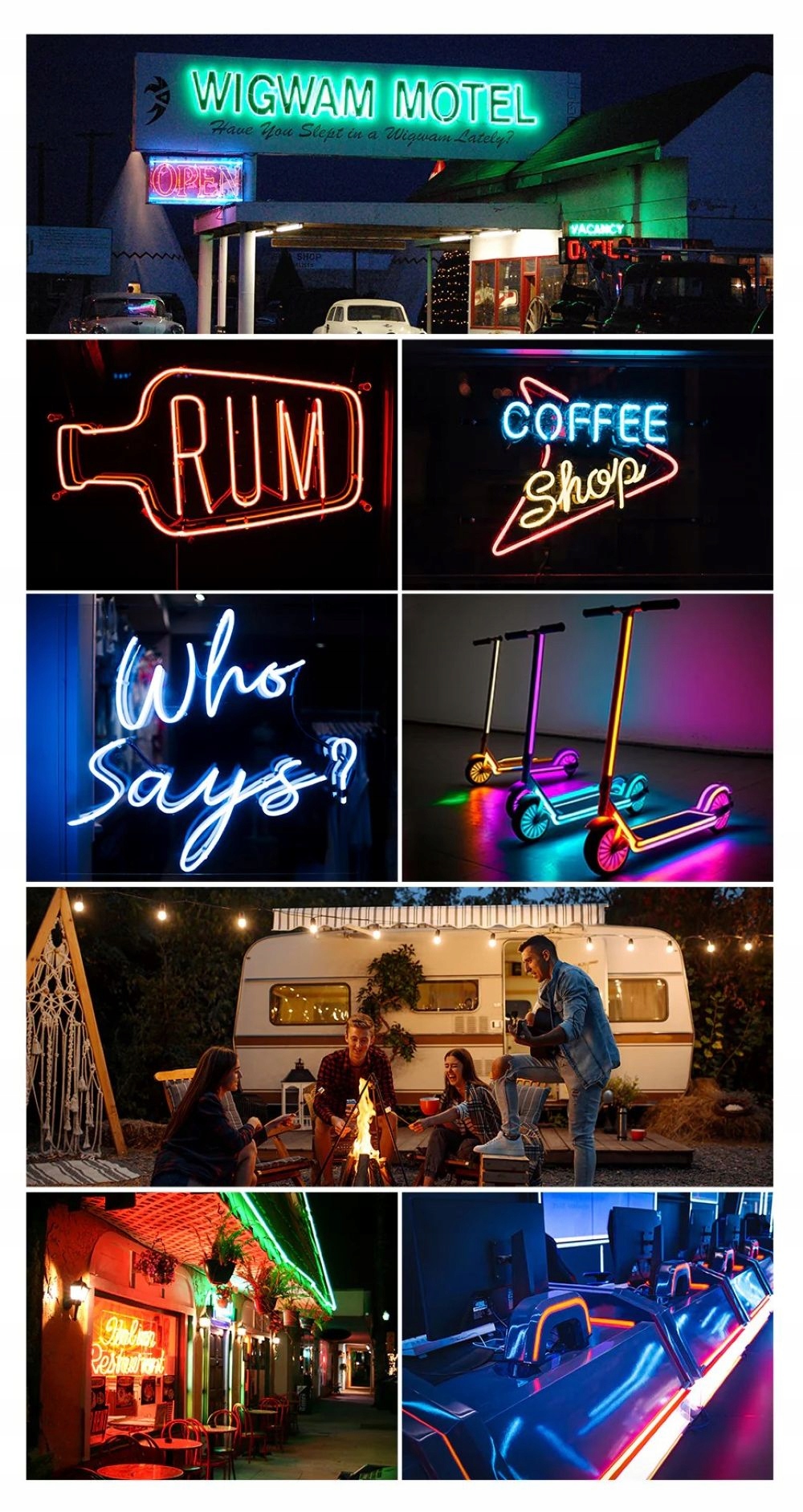 Світлодіодна стрічка підходить як для інтер'єрів, так і для відкритих просторів. Він висвітлює магазини, бари, велосипеди, скутери, кемпінгові трейлери, а також ігрові станції та розважальні кімнати. Його гнучкість та ефективна зовнішність роблять його популярним вибором у заході та рекламній індустрії.