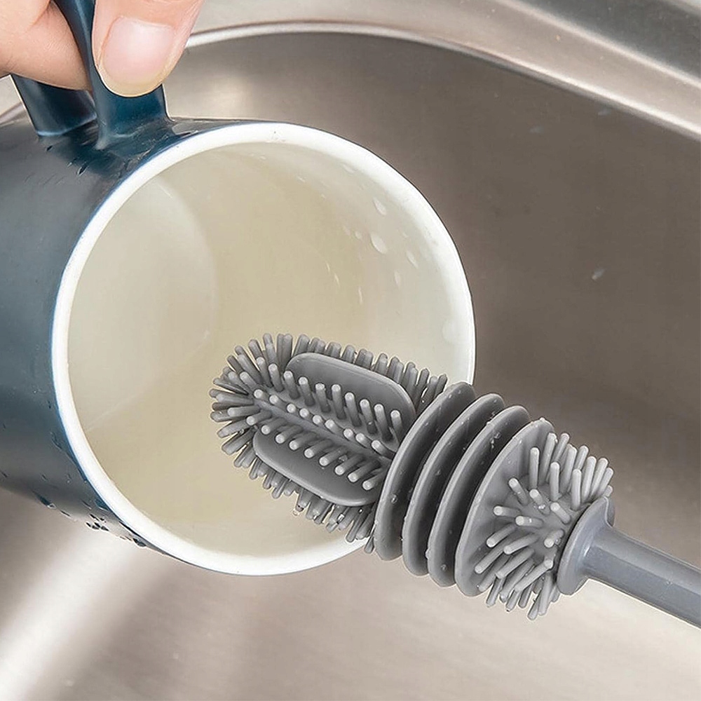 Наша щітка не тільки ефективна та делікатна, але й дуже практична у використанні. Його м'яка структура забезпечує оптимальне очищення, одночасно захищаючи делікатні поверхні пляшок. Крім того, виготовлений із силікону, його легко чистити, що робить його простим і зручним утримання в чистоті.