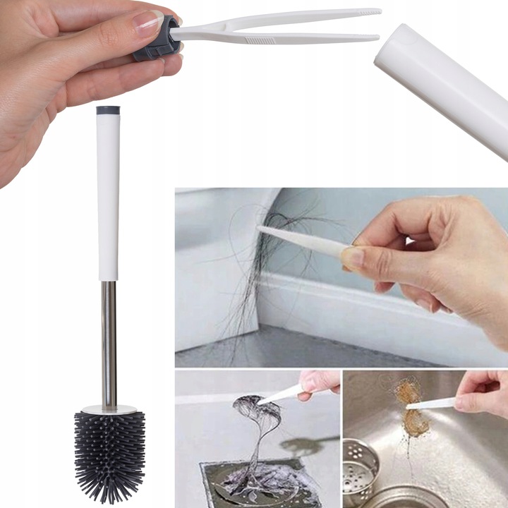 В ручку силіконової щітки вбудований пінцет, який дозволяє видаляти волосся та інші забруднення в місцях, розташованих у раковині, пральній машині, ванні, душі тощо.