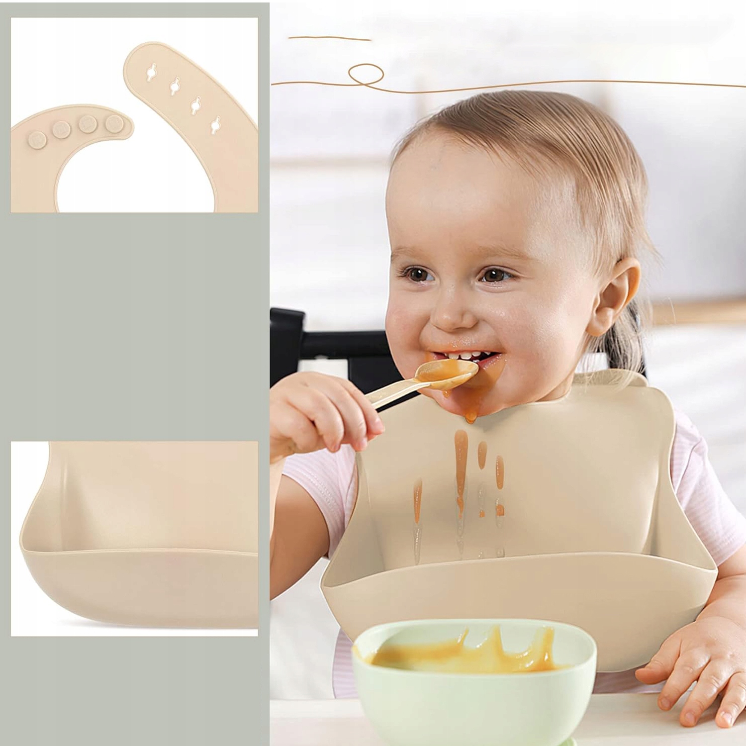 - Силіконовий нагрудник, який регулюється за допомогою кнопокі великий піддон для крапель вловлюють їжу, що падає з рота дитини, і запобігають її падінню на підлогу та одяг.