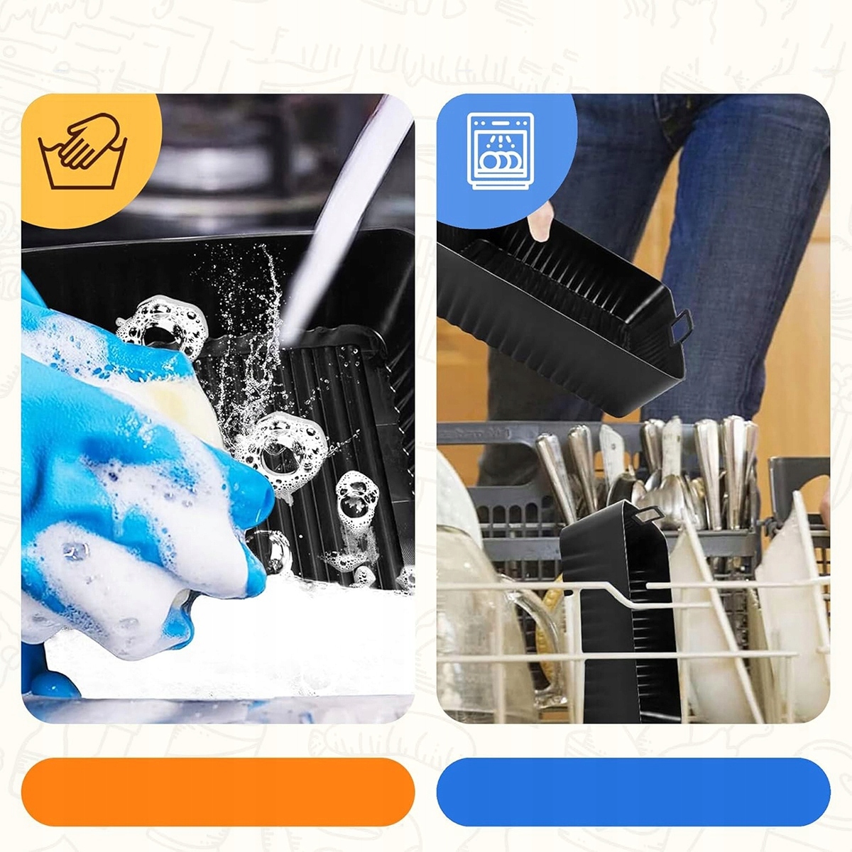 Можна мити вручну та в посудомийній машині. Силіконовий матеріал стійкий до розривів і може використовуватися повторно протягом тривалого часу. Можна мити вручну та в посудомийній машині. Силіконовий матеріал стійкий до розривів і може використовуватися повторно протягом тривалого часу.