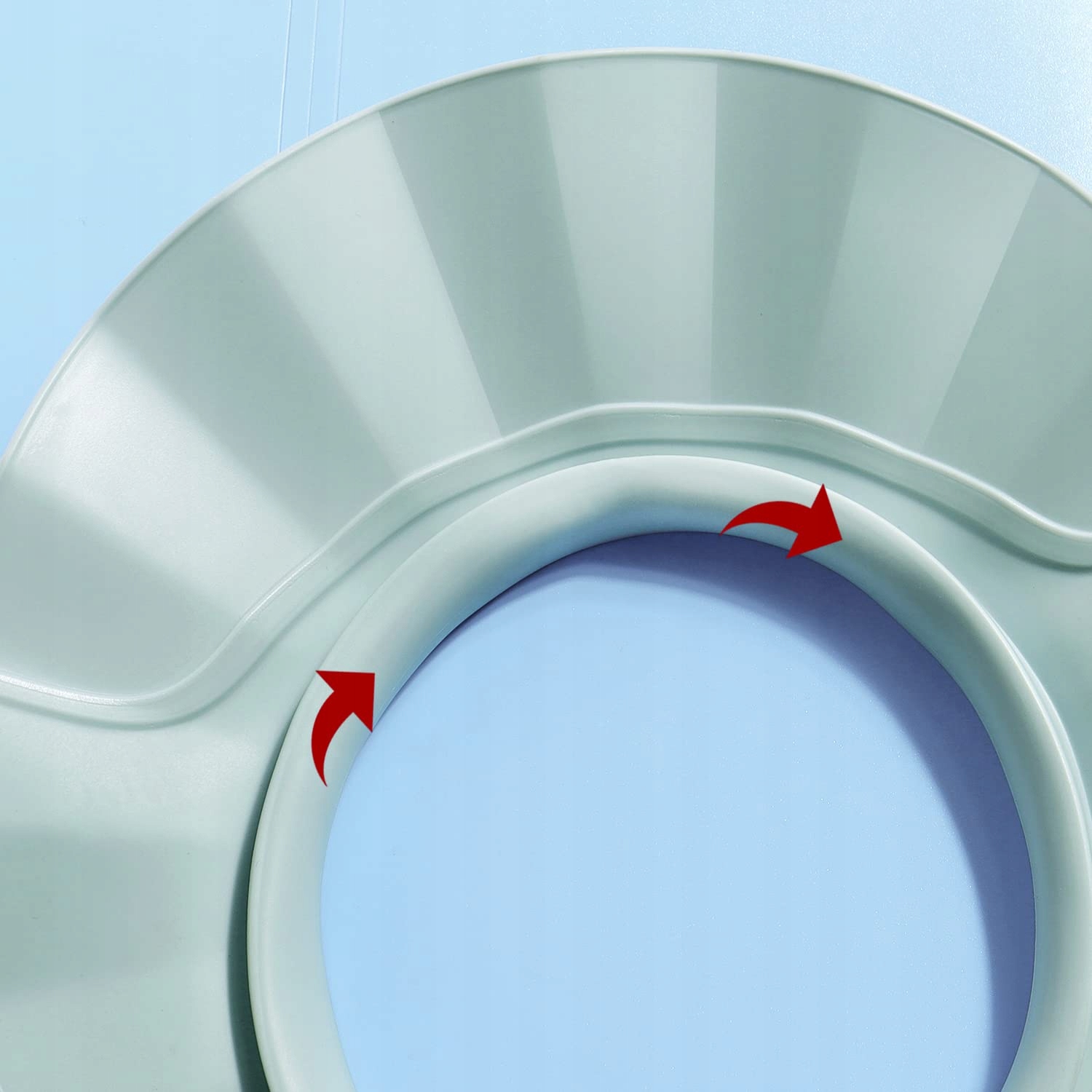 Завдяки спеціально розробленій запатентованій структурі, комбінації двох матеріалів (жорсткий козирок і м’який силікон), крайка захистить очі, вуха та обличчя вашої дитини від води та шампуню. Ніжне блакитне покриття додає шарму та елегантності нашому продукту.
