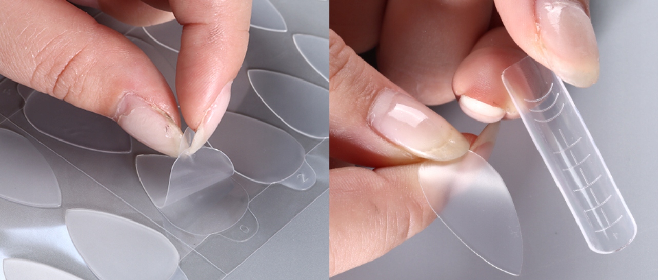 ➡️ Приклейте силіконову форму до подвійної форми, потім заповніть порожній простір вибраними французькими засобами для укладання та висушіть у лампі.
