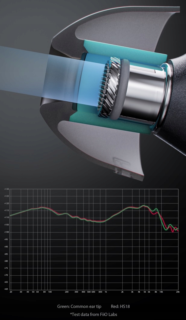 HS18, як і інші продукти FiiO, також характеризується високоякісними конструкційними матеріалами. Завдяки високоякісному медичному силікону від Shin-Etsu Chemical Co., HS18 має дуже чистий матеріал і виглядає дуже прозорим. Важливо також те, що силікон дуже приємний до шкіри, тому навіть люди з чутливою шкірою можуть комфортно та довго слухати музику без будь-яких турбот.
