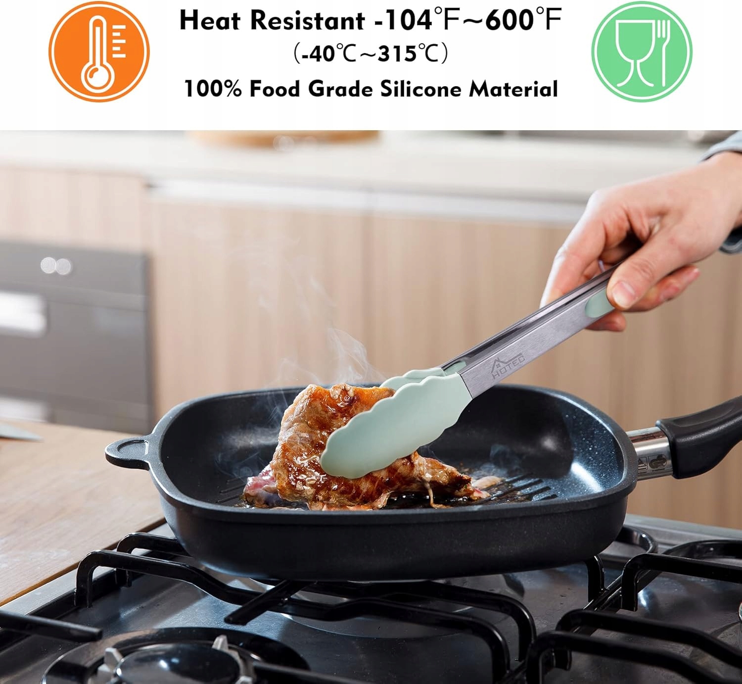 Щипці з нержавіючої сталі та оброблені температурним силіконом стійкий до 220°C. Вони не дряпають антипригарне покриття!