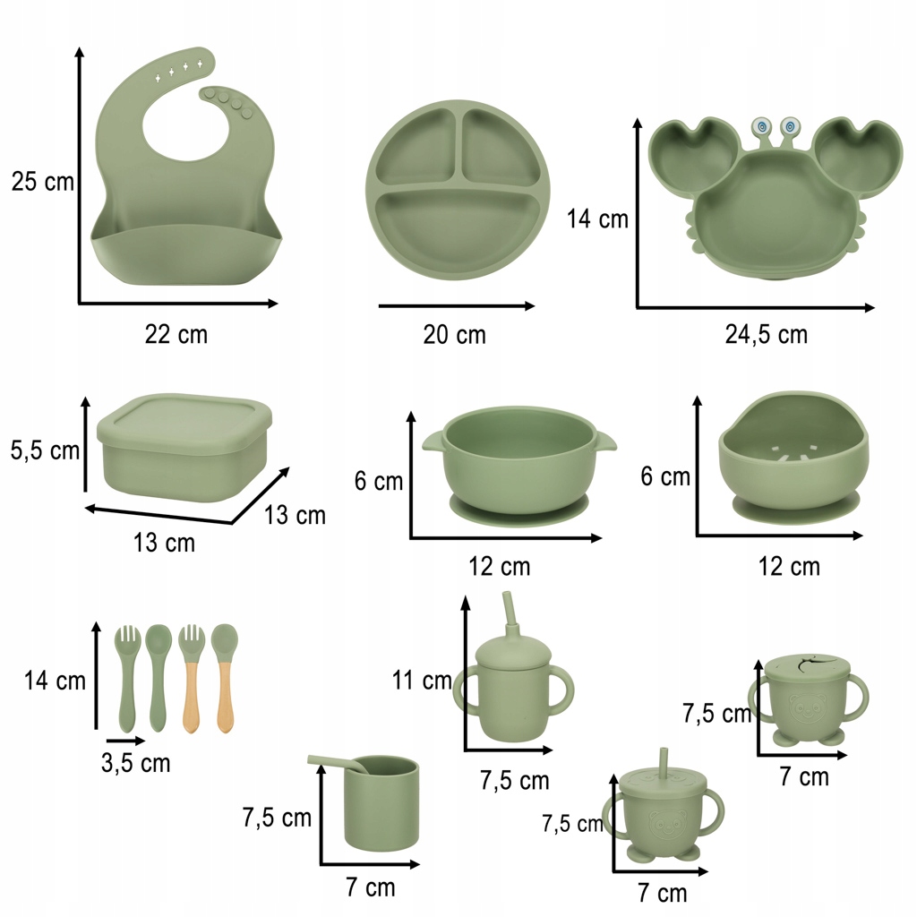 Виготовлений із безпечного силікону - Кожен елемент набору має гладкі краї , а розмір столових приладів спеціально пристосований до маленьких рук - завдяки цьому малюк може використовувати страви, навчаючись їсти самостійно.