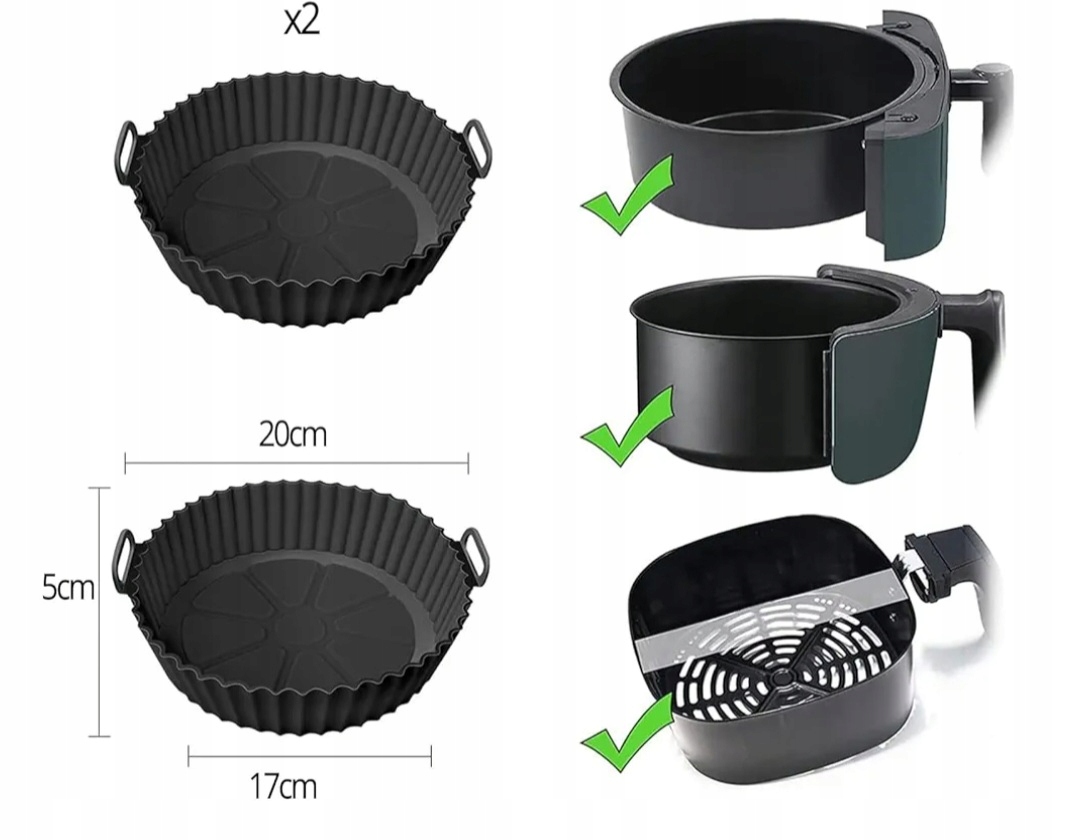 - Силіконова форма для фритюрниці - 2 багаторазові силіконові форми, більше не потрібно чистити кошик для гарячого повітря. Розміри: верх 20 см / низ 17 см / висота 5 см, підходить для фритюрниць об'ємом до 8 літрів. (Також можна використовувати в мікрохвильових печах і духовках)
