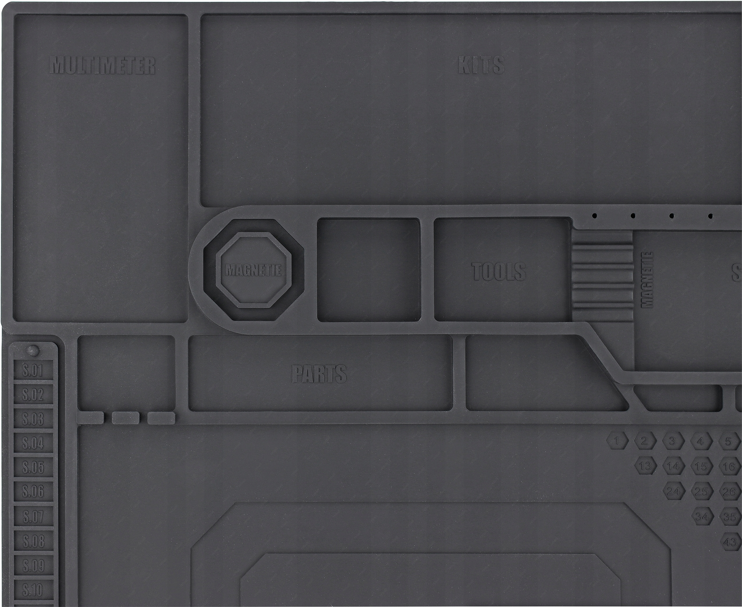 Він виготовлений із силікону, стійкого до температури 500°C. Завдяки цьому паяльні роботи можна виконувати безпосередньо на друкованій платі, розміщеній на килимку.