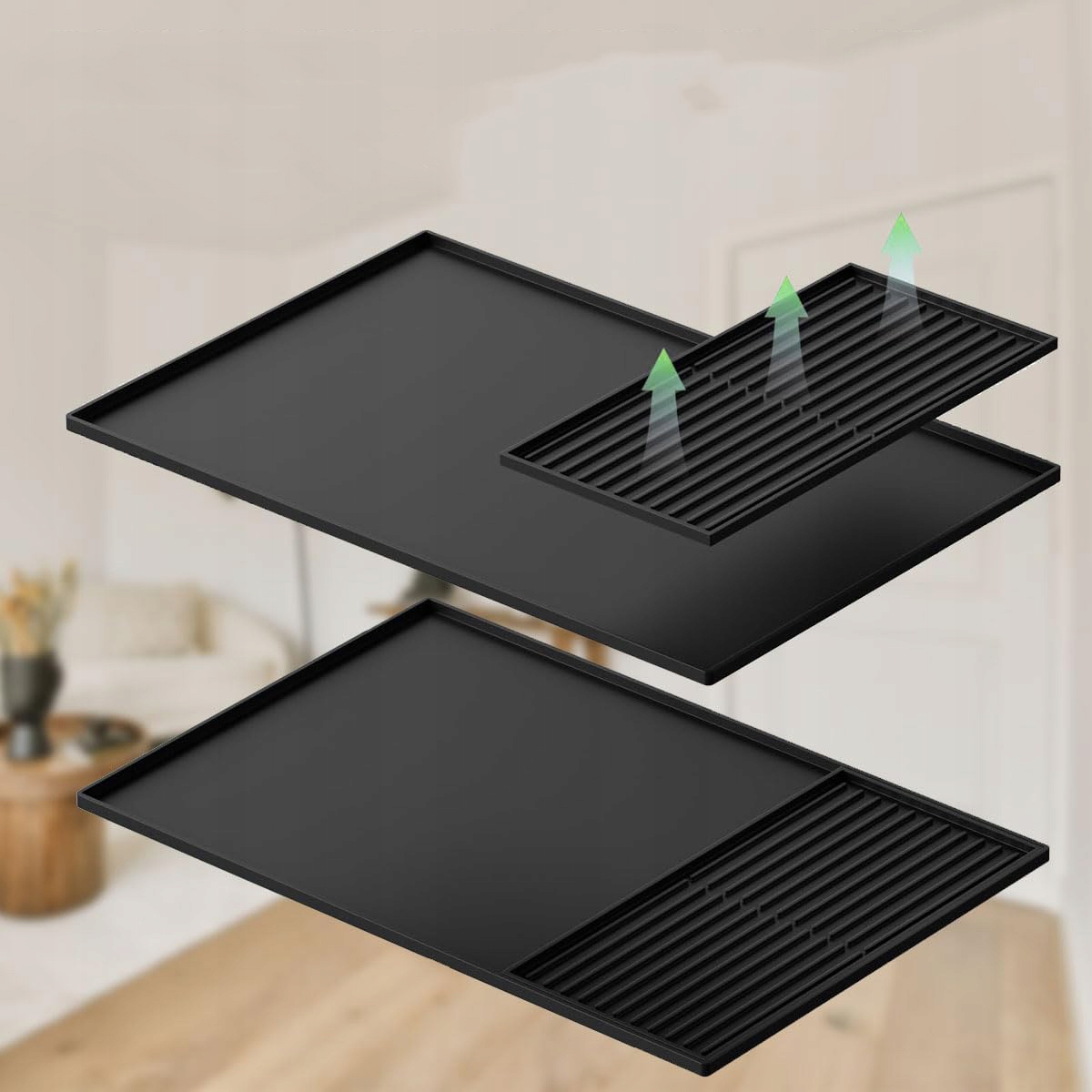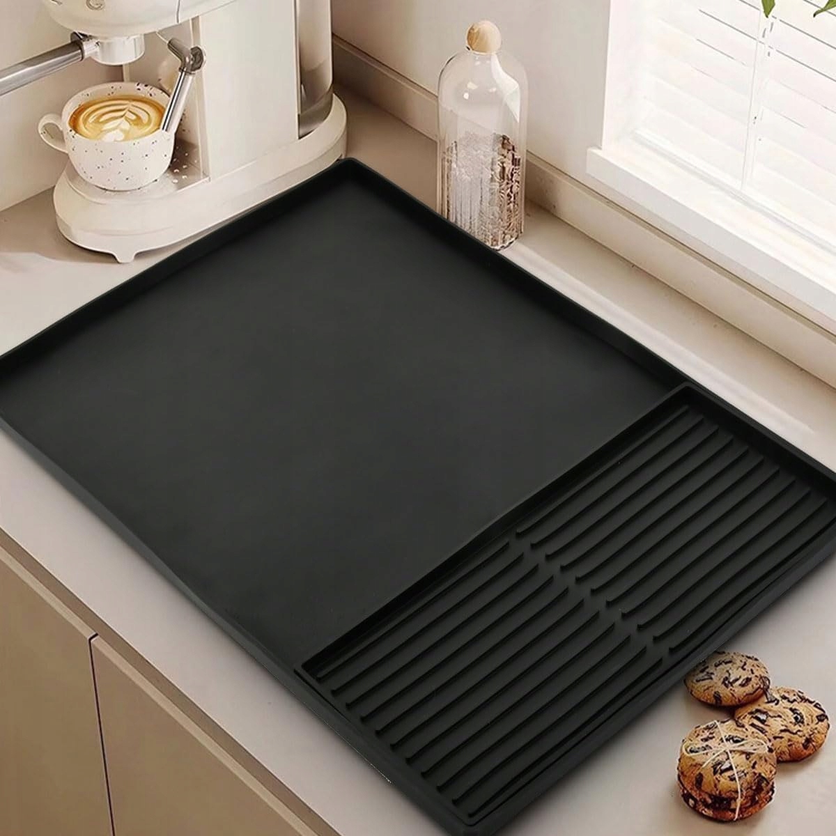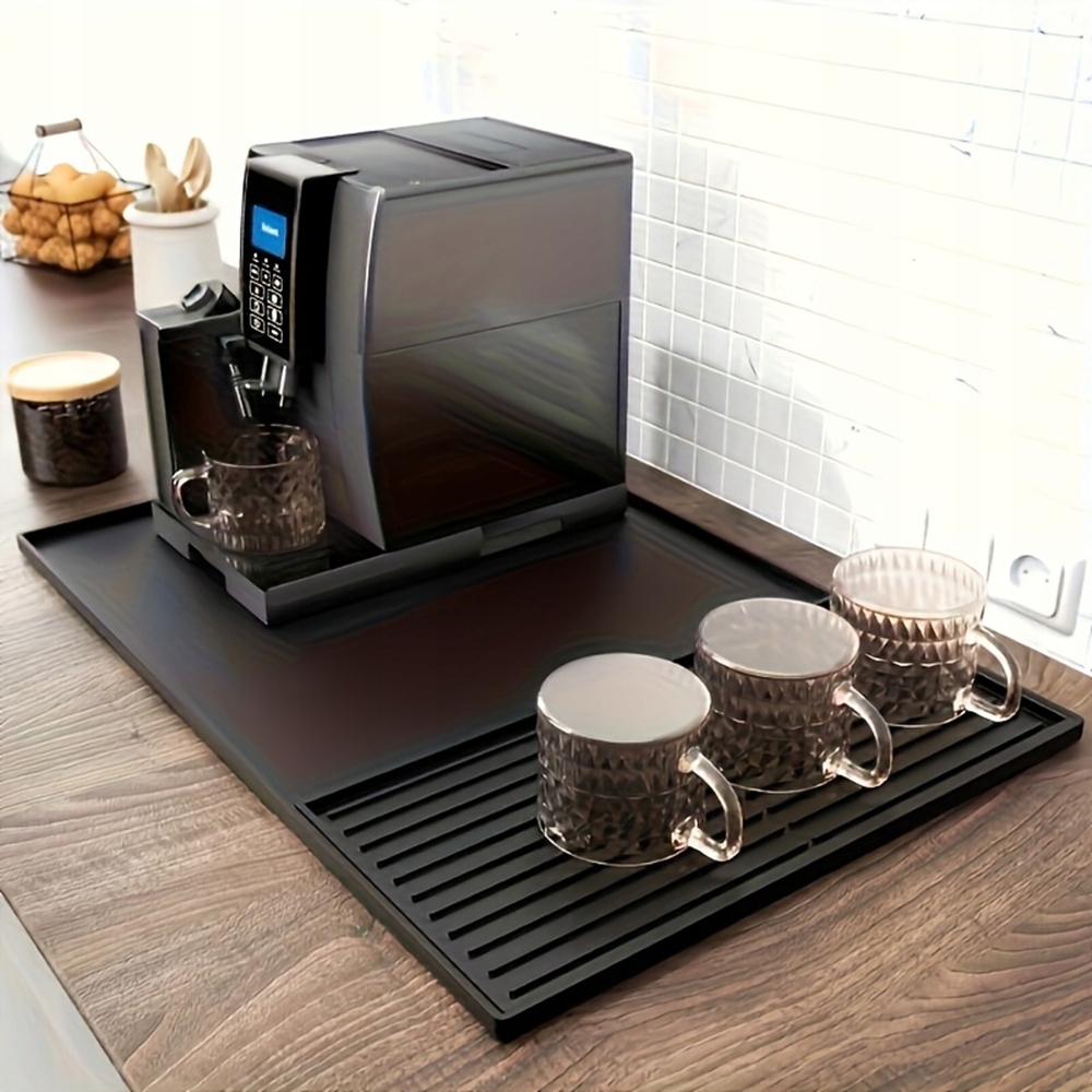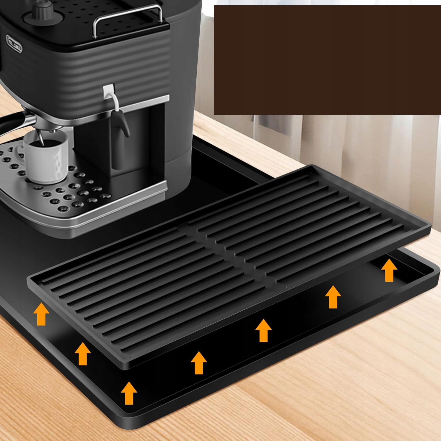 ⬅️ 【Дизайн із розділеними зонами】 Кавовий килимок має 2 зони, 2/3 призначені в основному для розміщення великих приладів, наприклад кавомашин, а 1/3 має функцію зливу, що зручно для розміщення кавових чашок, незалежно від того, чи були вони щойно вимиті, чи готова кавова чашка використання.