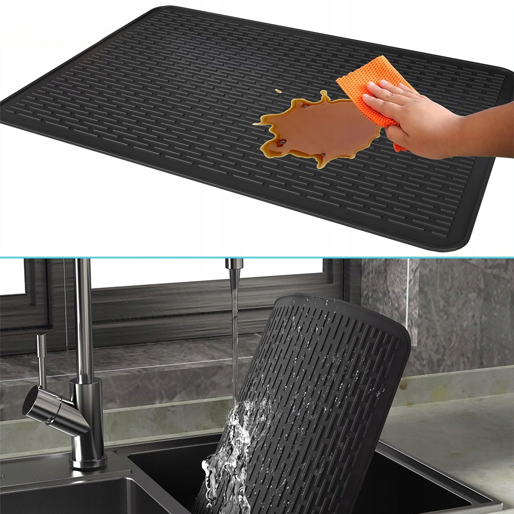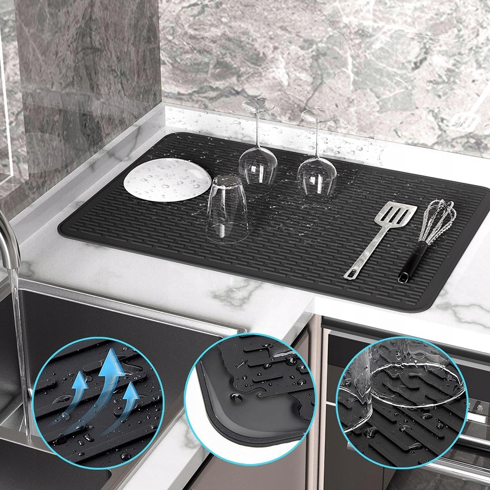 Унікальний дизайн опуклих широких канавок посилює потік повітря, покращує вентиляцію та ефективно поглинає краплі з посуду, склянок, фруктів і овочів. Високі краї та водонепроникна основа зберігають стільницю сухою та чистою, що робить її ідеальним килимком для сушіння на кухні.
