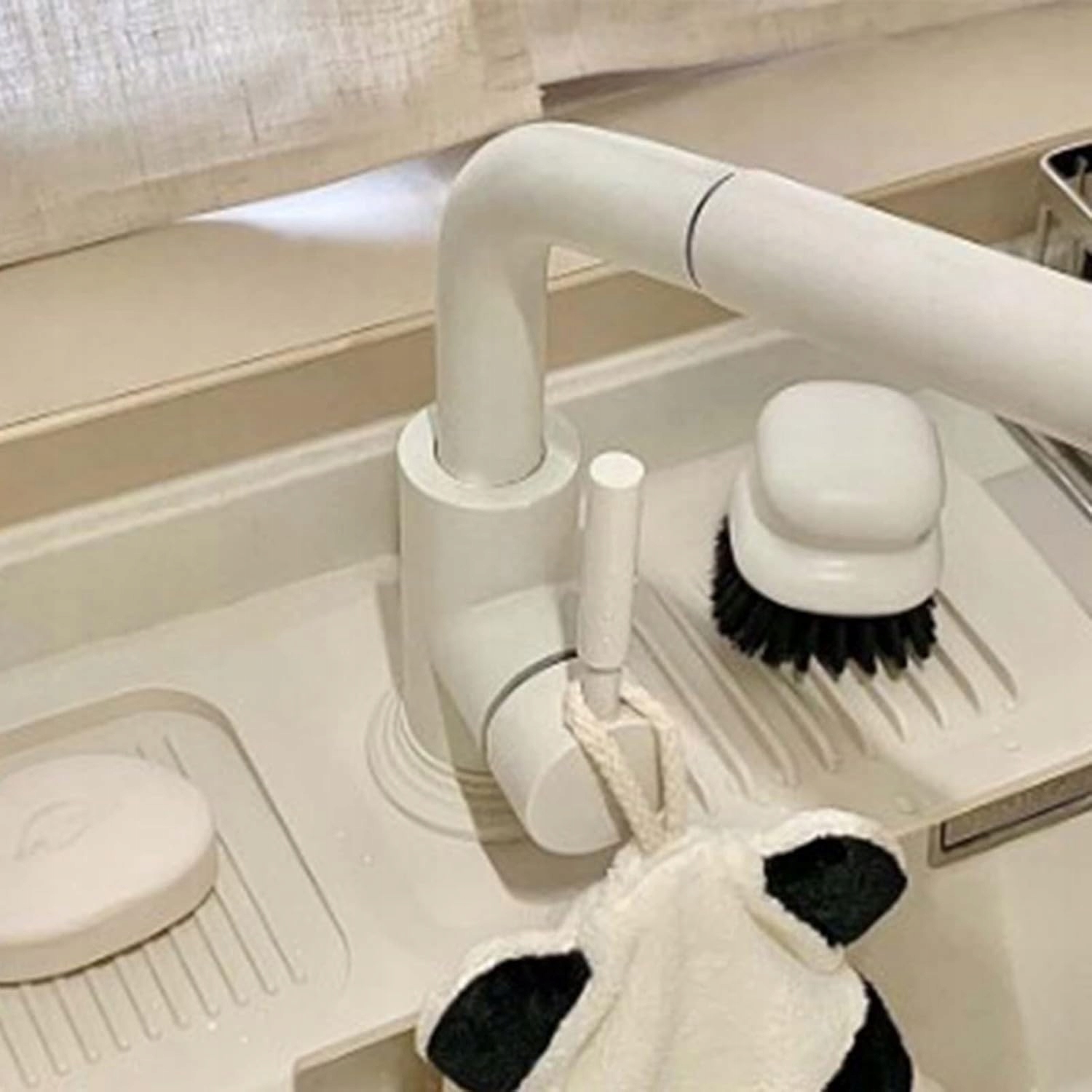 Високоякісний матеріал Ця кришка кухонного змішувача виготовлена із силікону. Він багаторазовий, міцний і його можна мити в раковині або посудомийній машині. Представляємо нашу нову покращену товщу та ширшу силіконову кришку для кухонної раковини, яка збереже вашу мийку сухою та чистою. Складна подушечка для сушіння крана для раковини легко чиститься, і її можна скласти для використання, не турбуючись про відстань між стіною та краном. . Ви можете розмістити пральну машину під краном кухонної раковини або розмістити на ній зубну щітку, мило, миючий засіб для обличчя, посудомийну машину та чашки. Велика кількість етапів використання - це не тільки кришка змішувача, але й тримач для вологої губки, ганчірки, рідини для миття посуду, щітки для чищення, засобу для чищення та всіх аксесуарів для ванної чи кухні та кухонних пристосувань. Використовуйте кришку для раковини на кухні, у ванній кімнаті, в кемпінгу, барі, на фермі та інших місцях, вона добре працює. Легке встановлення за допомогою методу «зроби сам», один отвір під кран можна вирізати, чого не можуть інші продукти. Установка килимка для раковини не вимагає використання інструментів. Легко загорнути та розмістити на більшості кухонь для сучасного вигляду. Кришка кухонної раковини допоможе вам упорядкувати дрібні речі, помістивши губку з милом для рук або миючим засобом на килимок під краном, щоб зменшити безлад навколо крана кухонної раковини. Крім того, місце, куди ви кладете речі, оснащене протиковзкими виступами, які запобігають зісковзуванню дрібних предметів.