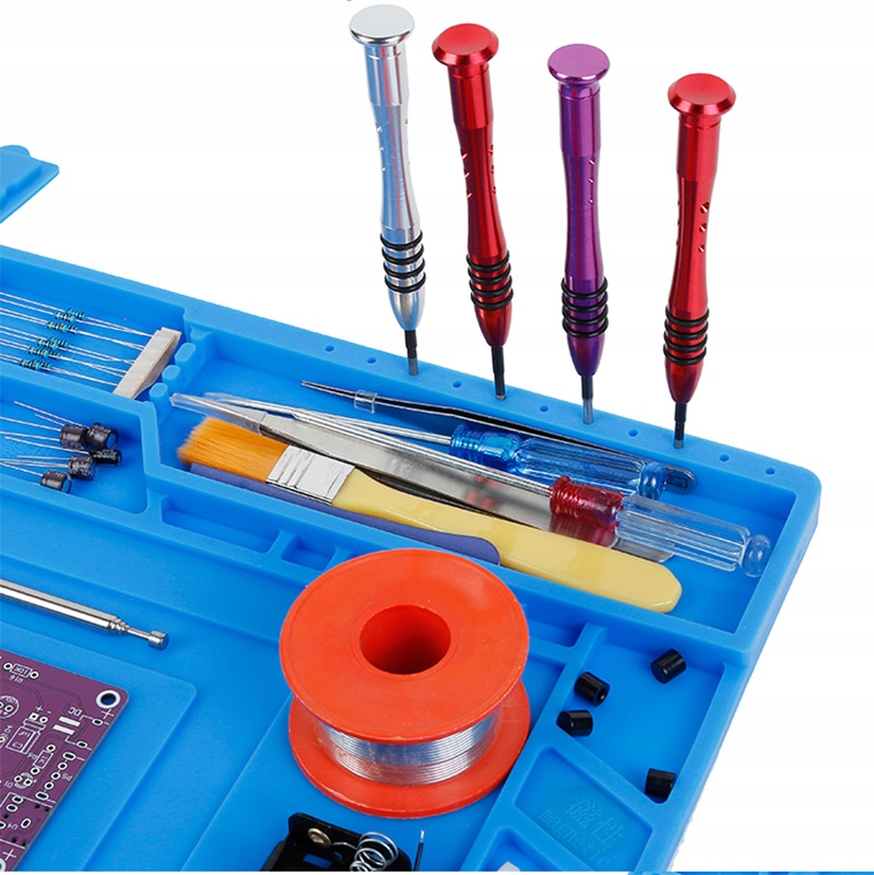 - Захист від пошкоджень: силіконовий килимок запобігає пошкодженню робочої поверхні, такої як стіл або парта, під час роботи з інструментами для пайки.