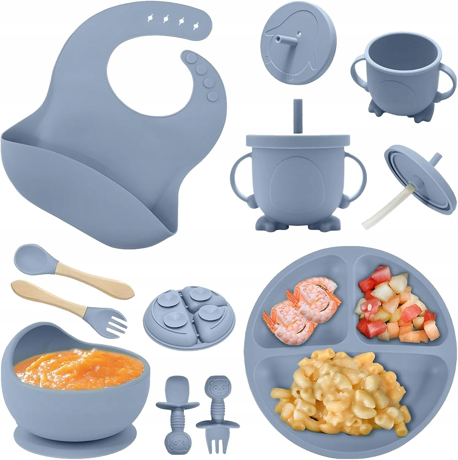 Виготовлено з харчового силікону, не містить BPA та PVC. Миски, тарілка та кухоль витримують як високі, так і низькі температури, що робить їх придатними для мікрохвильової печі, духовки, холодильника та морозильника.