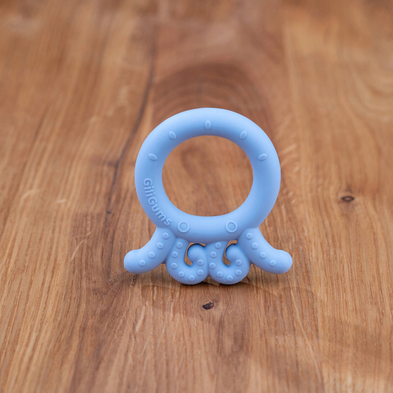 Стильний зовнішній вигляд і красивий синій колір роблять його модним аксесуаром для кожного малюка. Восьминіг прикрашений крихітними виступами, які при укусі ніжно масажують хворі ясна малюка, приносячи полегшення.