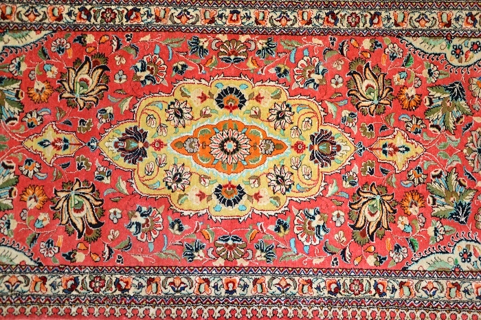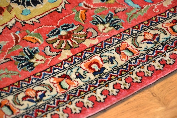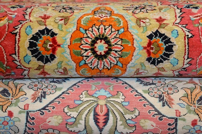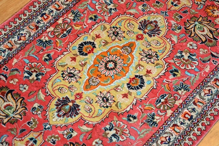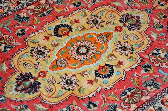 СПРАВЖНІЙ «ШЕДЕВР» СХІДНОГО МИСТЕЦТВА ОБРОБКИ ... Висококласний і надзвичайно красивий, оригінальний перський килим - Килим GHOUM - ручної роботи та виготовлений з 100% натуральний шовк на шовковій основі, з щільним кроєм, блискучим флісом. Килим має сертифікат якості та походження. Східний дизайн (вражаючий медальйон, оточений вишуканими квітковими композиціями) і гармонійно контрастні кольори роблять його в розгорнутому вигляді надзвичайно красивим і гідним.