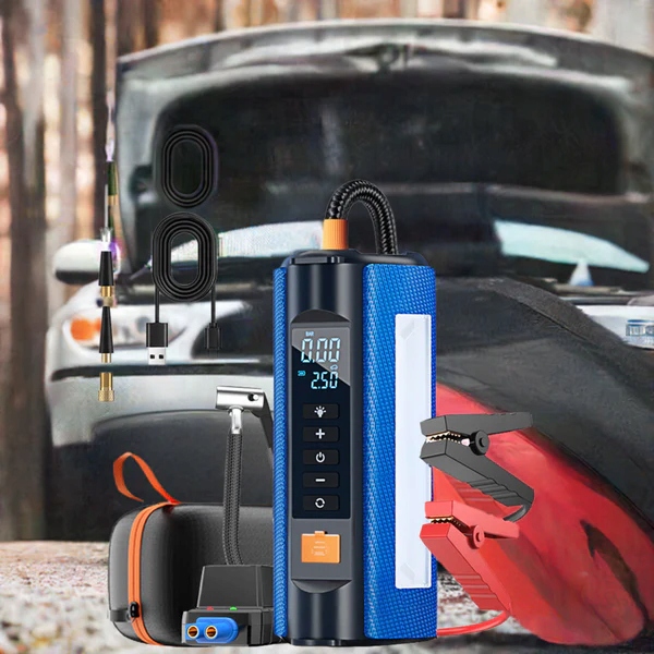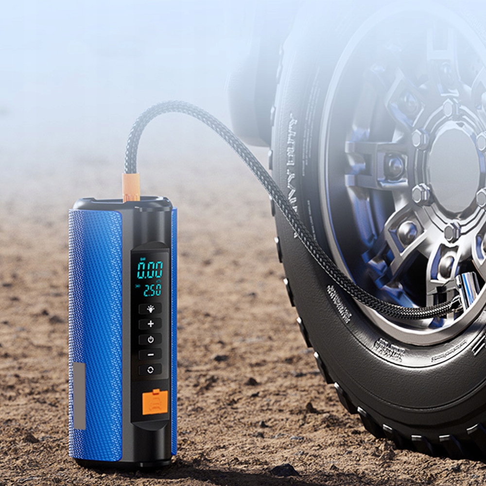 ☑ 【аварійне джерело живлення для запуску автомобіля з інтенсивністю 2000 р. A】 Портативний повітряний компресор має піку з об'ємом 2000 А, що дозволяє запускати транспортні засоби з 7,0 л і дизельними бензиновими двигунами 5,0 л з напругою 12 В за кілька секунд. Сильний підсилювач акумулятора автомобіля - до 20 запусків на одному заряді, навіть при екстремальних температурах (трохи більше 25% заряду достатньо для запуску автомобіля). Підходить для пасажирських автомобілів, вантажівок, мотоциклів, транспортних засобів та інших. Наш автомобіль Microcompressor використовує унікальний механізм турбонаддуву, який може забезпечити максимальний тиск 150 фунт/кв. Дюйм та потік повітря 35 л/хв, підтримує виявлення тиску в шині, зупиняючи значення попереднього набору та змінюючи одиницю.