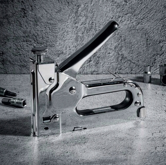 Металевий штаплер - популярна назва "Приймач" - це ідеальний інструмент для складання та майстерні, що включає тканини, картон, паперу або шкіряне кріплення до дерева. Висячі скоби. Перевага штаплера - це його універсальність у типових робітних робіт, з кріпленням тканин або ізоляційною фольгами. Ідеально підходить для висячої реклами чи реклами. замок ручки захищає від випадкового початку штаплера.