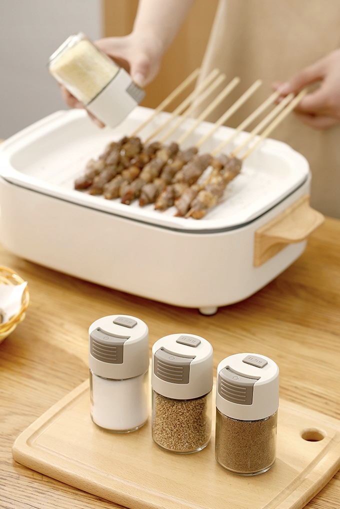 Скляний контейнер для спецій із кнопкою вимірювання 5 г, без необхідності відкручувати кришку.