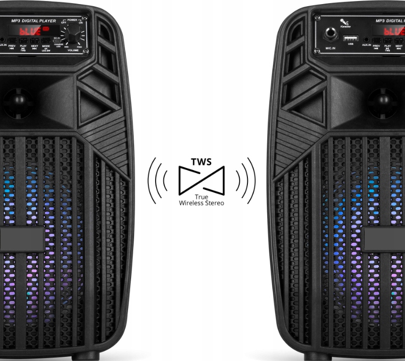 Підключіть два динаміки з бездротовим каналом і створіть пару стереосистеми на основі TWS Technologies, і ваша подія буде легендарною! Сильний, широкий стерео звук та інтерактивне освітлення створить незабутні музичні зображення!