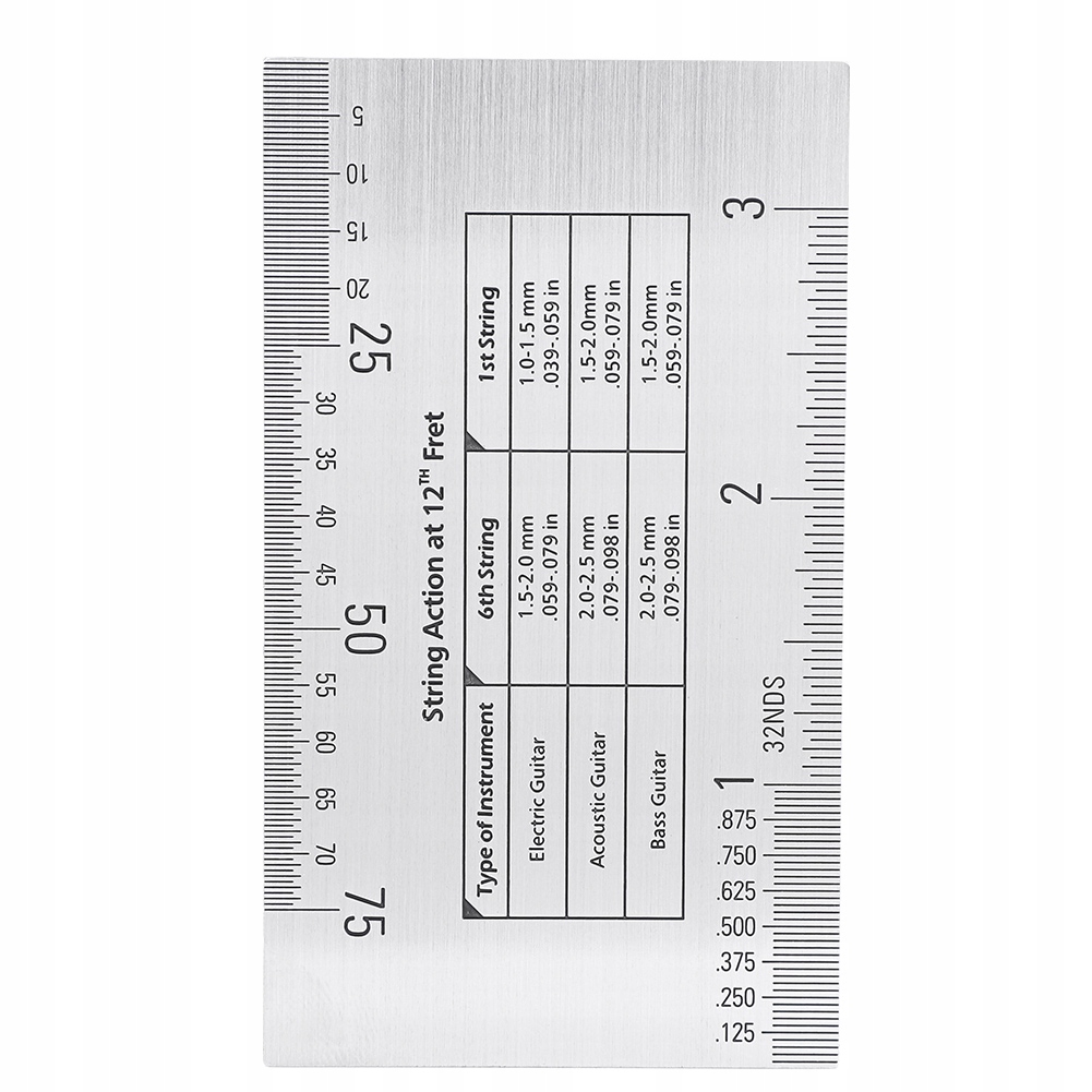 - Отримання точних вимірювань дії на висоту та відстань струни, висота сідла мосту, глибина сідла, висота компонента, порогові прогалини глибини та висоту гайки.