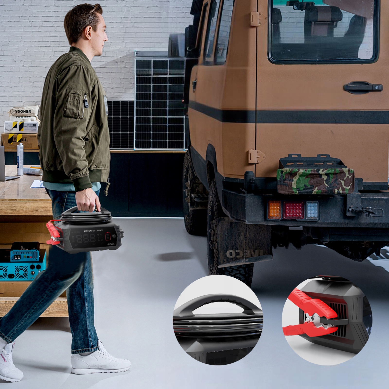 【Широке використання】 Автомобільний зарядний пристрій призначений для акумуляторів LifePO4 6 В/12 В/24 В, літію та кислоти-кислотними батарейами (AGM, кальцій, гель, MF, EFB, SLA, VRLA, VET тощо). Він широко використовується для безпечної та ефективної зарядки автомобілів, мотоциклів, човнів, трав, косарок тощо.