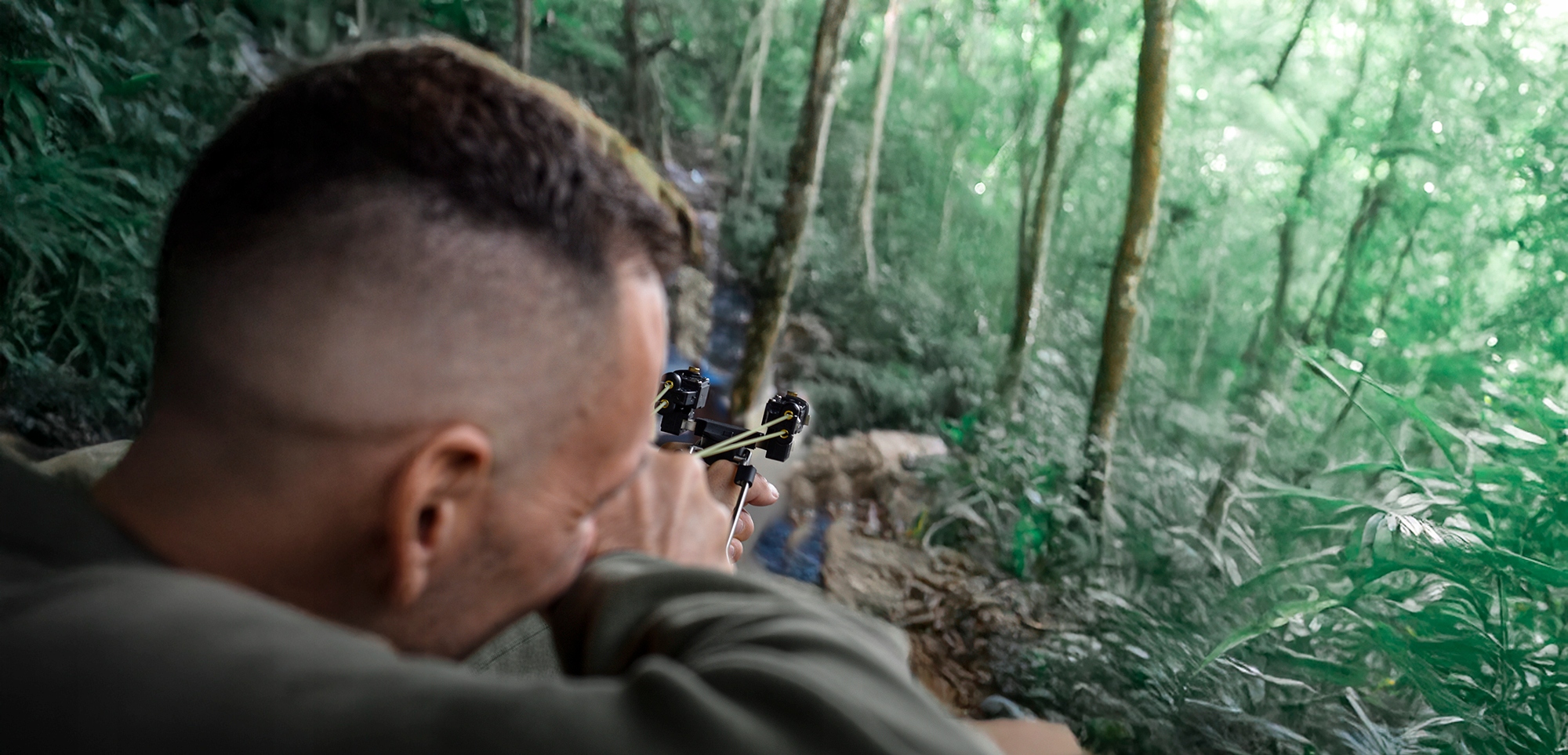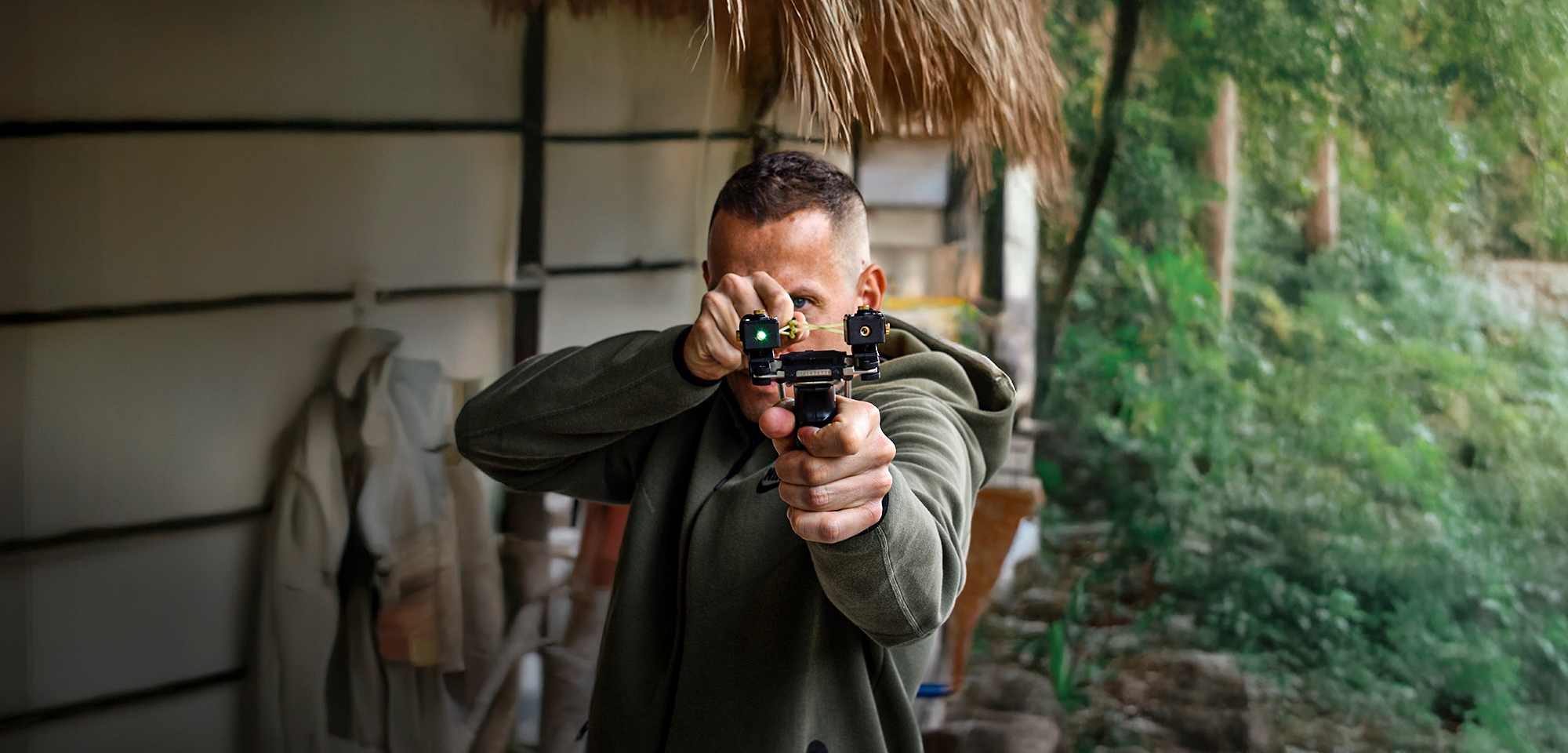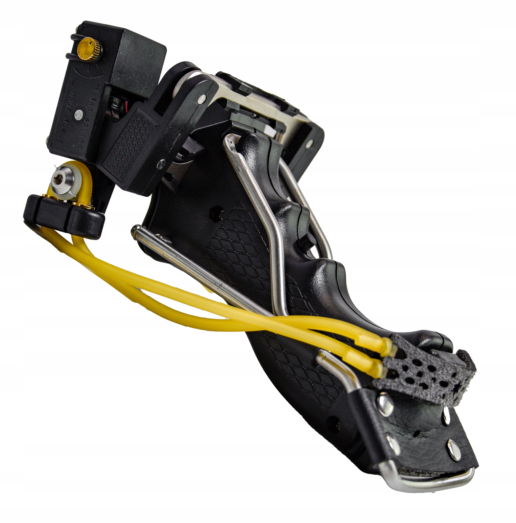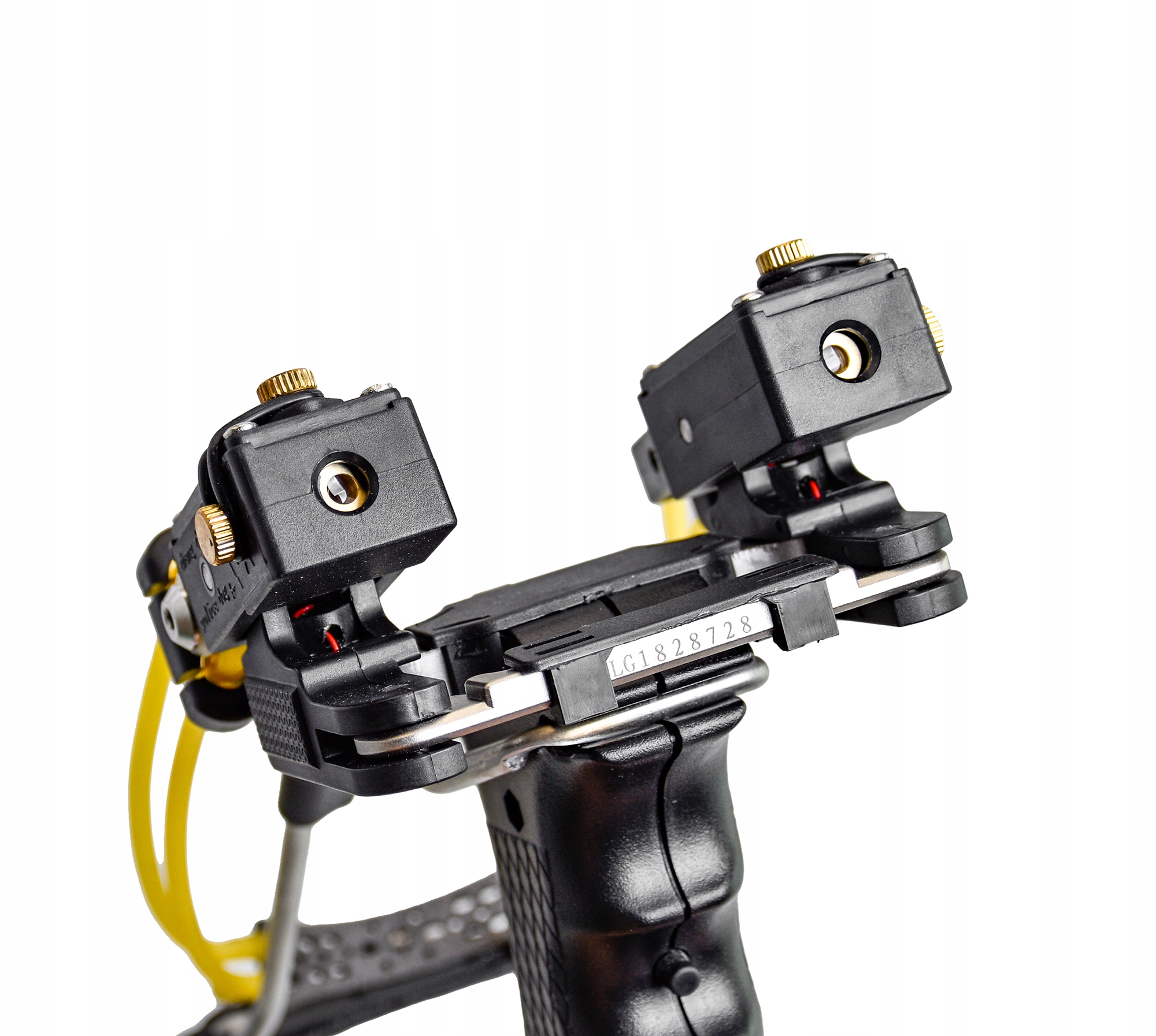 - Дві зелені лазерні приціли, встановлені у верхній частині рогатки, коли приціли увімкнено, один, але завдяки комутаторі, розміщеному на ручці, ми можемо швидко визначити, з якого прицілу (правого або лівого) ми хочемо використовувати в даний час, приціли додатково регулюються у вертикалі та горизонталі через гвинт у верхній частині. Вони живляться від 2x батареї AAA (невеликі пальці), додані до набору, які розміщуються в ручці ролики знизу. 4
