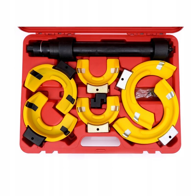 Професійний набір для зняття пружин в легкових автомобілях і мікроавтобусах. Наш набір цінується за універсальність, його можна використовувати в автомобілях BMW, TOYOTA, MITSUBISHI, VW, AUDI, SAAB, NISSAN, HONDA, SUBARU, VOLVO, OPEL, PORSCHE. Всі елементи набору виготовлені з дуже міцної товстої сталі, яка витримує високі зусилля стиску. Перевагою знімачів цього типу є висока сила стиснення, розподілена по великій поверхні, що дозволяє уникнути пошкодження пружин і ризику поломки знімача. Затискачі KRAFT&DELE мають додаткові кришки, які стабілізують пружину в затиску та захищають пружину від подряпин.