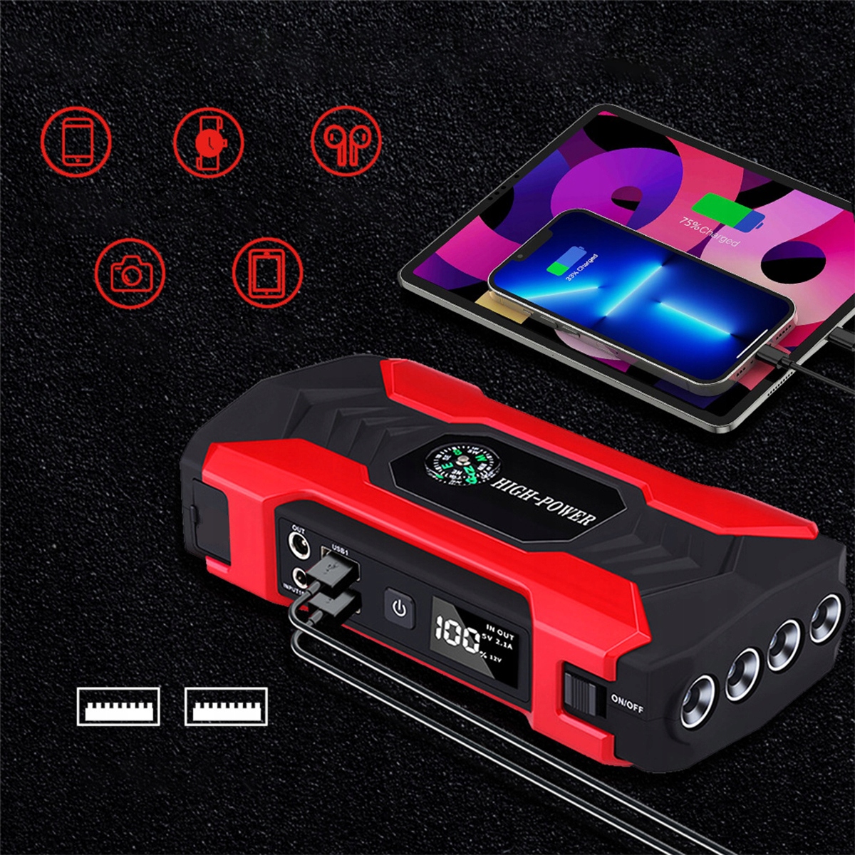 ✅Дозволяє швидше заряджати пристрої за допомогою USB-виходів 3-в-1 (5В-2,1А/19В/16В/12В) і сумісний майже з усіма USB-зарядними пристроями, включаючи мобільні телефони, планшети, цифрові камери та інші електронні пристрої.