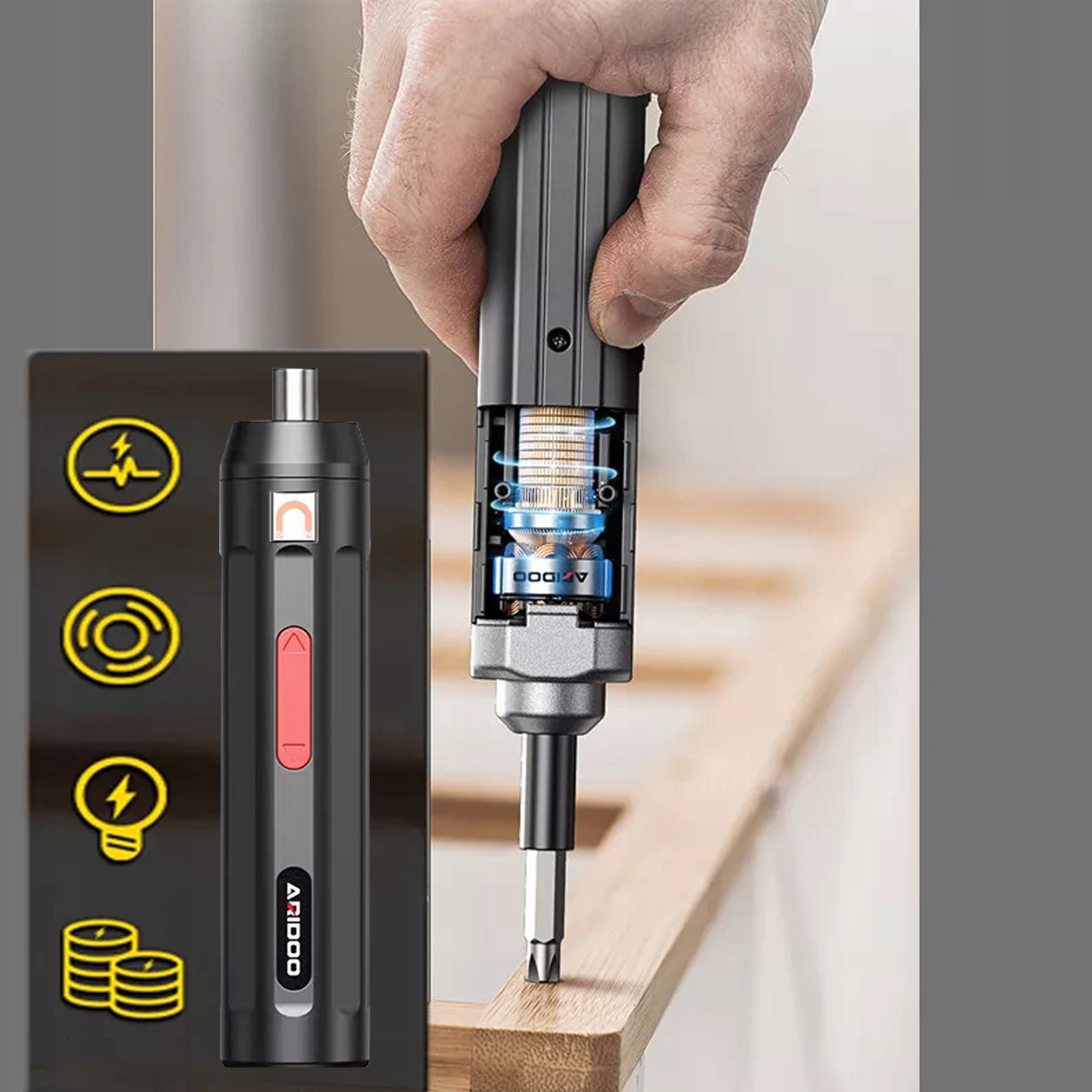 🔄- використовує двигун постійного струму з міцним магнітом , виготовленим з чистої міді з високою потужністю, який може легко закрутити гвинт у товсту тарілку з листяних порід.