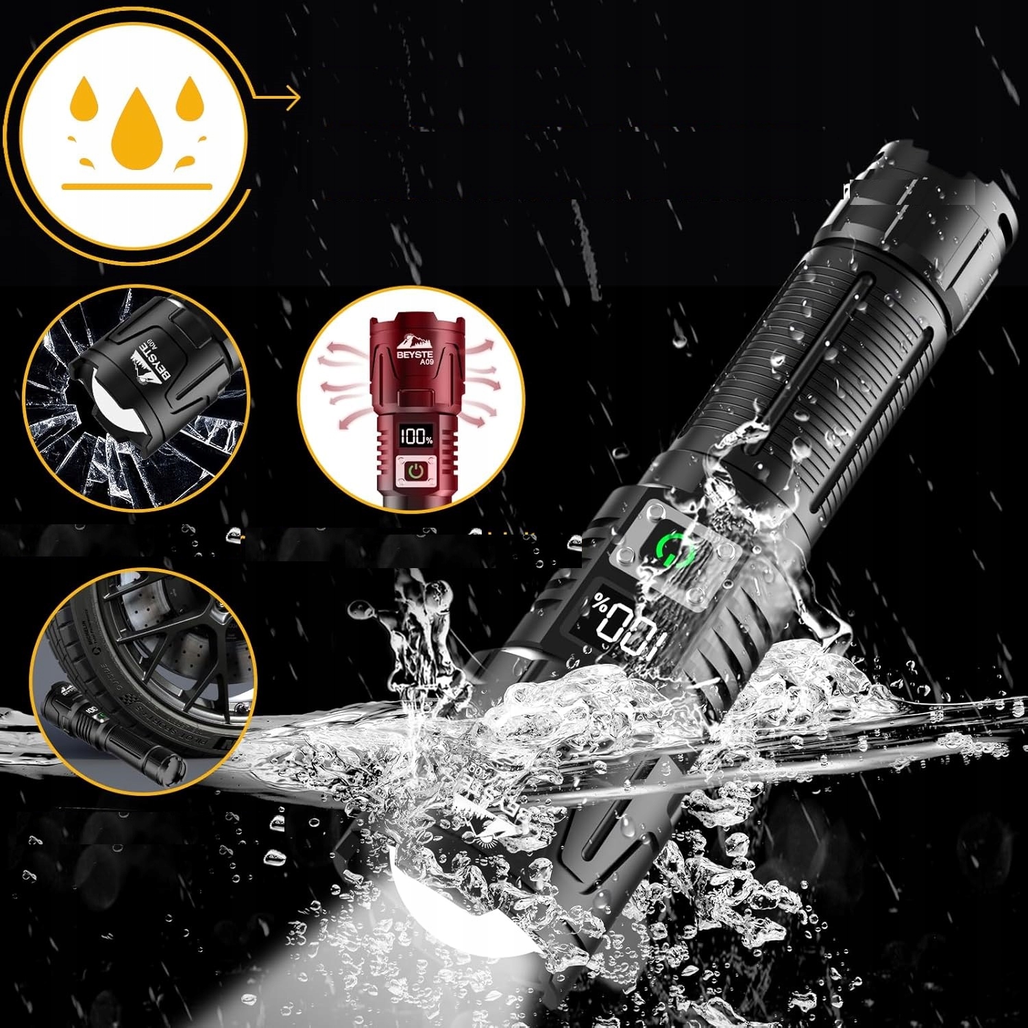 світлодіодний ліхтарик з можливістю зарядки надзвичайно міцний. Він виготовлений з сильного повітряного алюмінію, який стійкий до подряпин, ударів та ударів - навіть після того, як вантажівка вагою 20 тонн, він все ще залишається недоторканим. Побудована гумова ущільнення захищає від дощу та снігу. Світлодіодний ліхтарик із зарядкою USB призначений для заходів на свіжому повітрі, ідеально підходить для сухого походження, кемпінгу, бігу та інших.