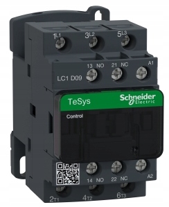 LC1D09B7 — це компактний 3-полюсний контактор TeSys D від Schneider Electric для двигунів. Номінальний струм 9A AC-3 4 кВт при 400 В, включає котушку змінного струму 24 В 50/60 Гц і допоміжні контакти 1НО + 1НО. Можна використовувати в програмах безпеки.