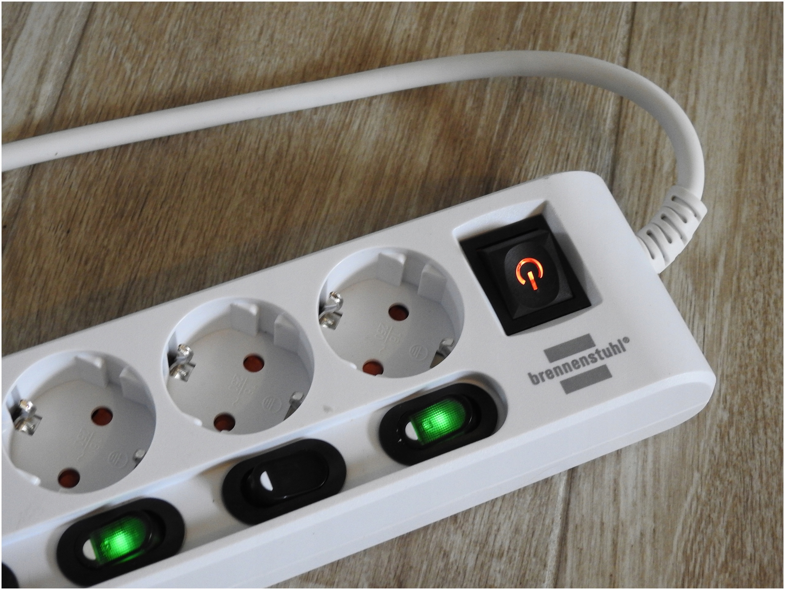 Подовжувач живлення BRENNENSTUHL. Має 6 розеток SCHUKO, кожна з яких має окремий двополюсний вимикач, і кабель довжиною 2 м