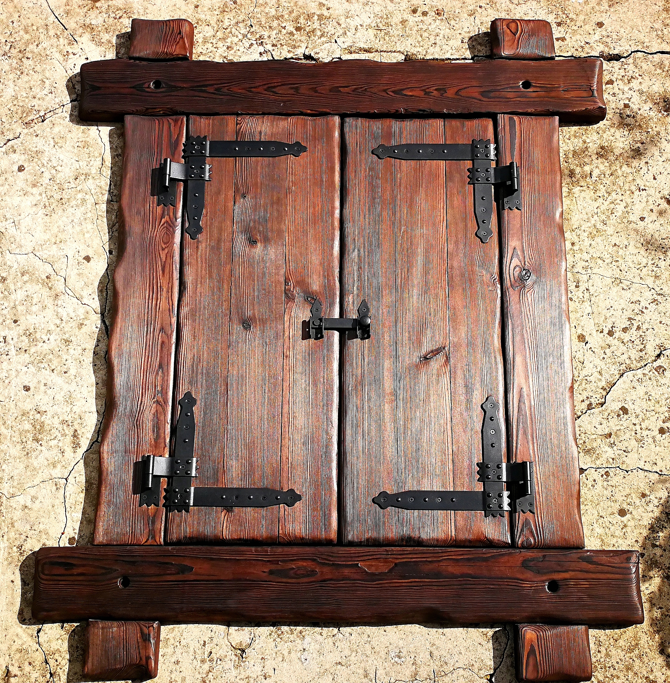 Предметом пропозиції є віконниця з соснового дерева, гарний колір отриманий завдяки спеціальній обробці деревини вогнем, що також забезпечує довговічність віконниці.