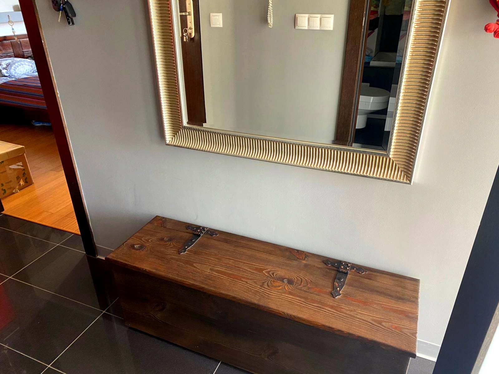 Сильний, суцільний стовбур, дошки товщиною близько 20 мм, він скручений гвинтами і склеюється. Його можна використовувати як меблі для передпокою, вітальні, спальні, контейнера для альтанок -подушок, садових аксесуарів тощо, лавка, сидіння, стіл або контейнер для іграшок. Його також можна використовувати як обладнання для стильних таверн, корчми тощо, може мати колеса, які можуть бути невидимими. Ціна задається орієнтовною ціною, це залежить від розмірів та способу закінчення грудної клітки. If you are interested in such a piece of furniture but in other sizes, appearance or finish, then you can agree in advance (Da, they are in - "dos taawy and pay, three at the bottom of the announcement). I issue an invoice without VAT (unregistered activities).