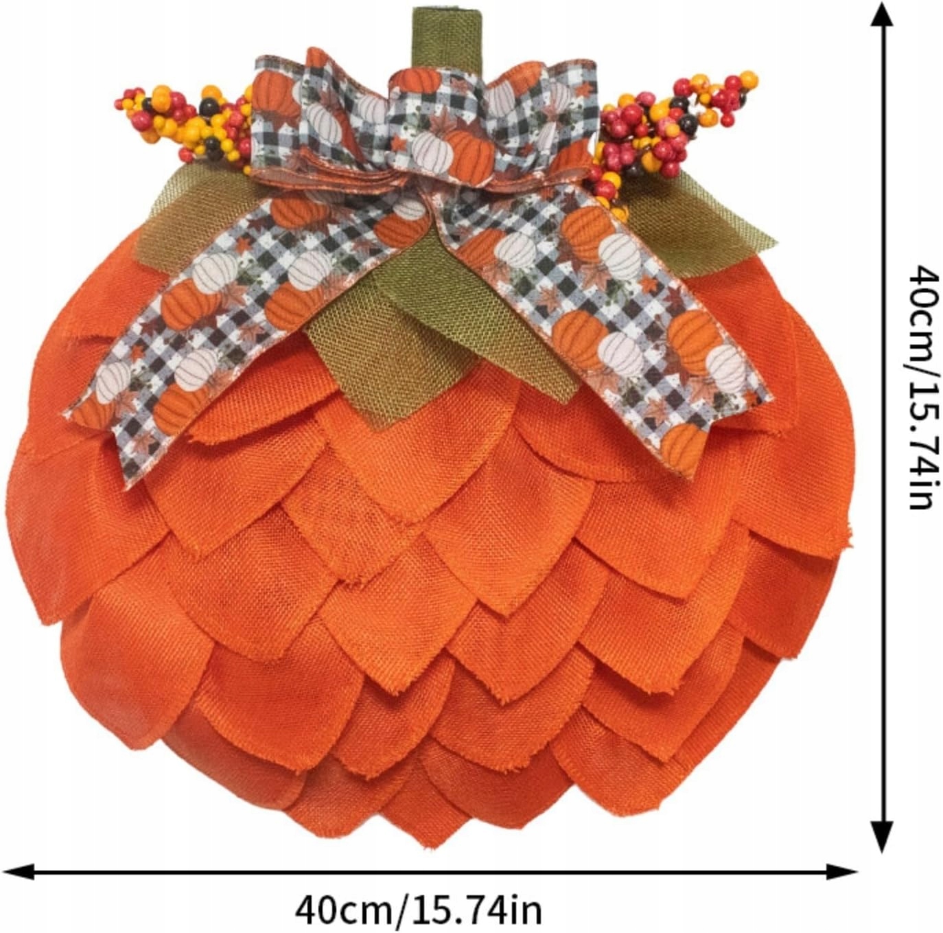 Універсальний домашній акцент: розміром 40 см цей виразний предмет проходить через стандартні дверні прорізи, вражаючи вікнами, камінами або як центральна частина столу на День подяки. Насичені помаранчеві відтінки та текстуровані гарбузи створюють миттєву осінню атмосферу – ідеально підходять для сезонних вінків для вхідних дверей чи інтер’єру фермерського будинку.