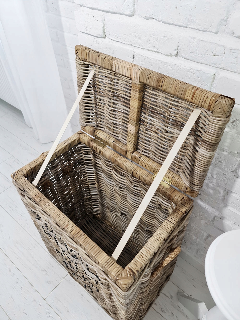 сільська коробка передач, кошик, контейнер Hampton, виготовлений з ротанга з кришкою. Він має стабільний кадр і особливо корисний як кошик для білизни (брудний), звичайно, він також може бути використаний для інших цілей. Він також ідеально знайдеться як багажник для іграшок у дитячій кімнаті або як ліжковий стіл у спальні. Зроблено вручну, пам’ятайте, що це природний продукт, і колір може бути трохи . Кришка прикріплена двома петлями.