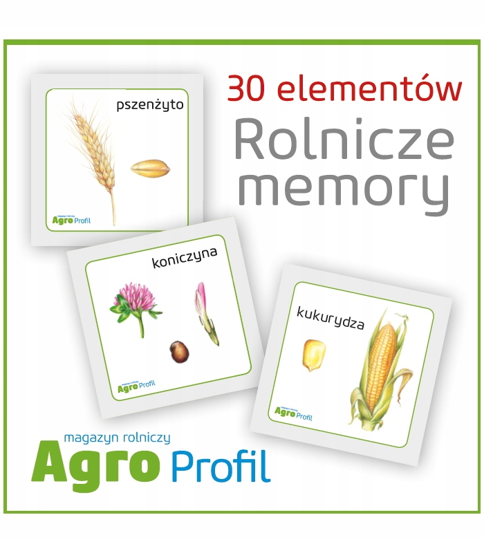 Гра на пам'ять (паритет) - містить 30 карт (15 пар). Спогади про сільське господарство - 15 оригінальних мальованих малюнків, які, серед іншого, представляють: зерна, колосся або рослина у фазі цвітіння. Формат: квадрат з ребром 6 см.