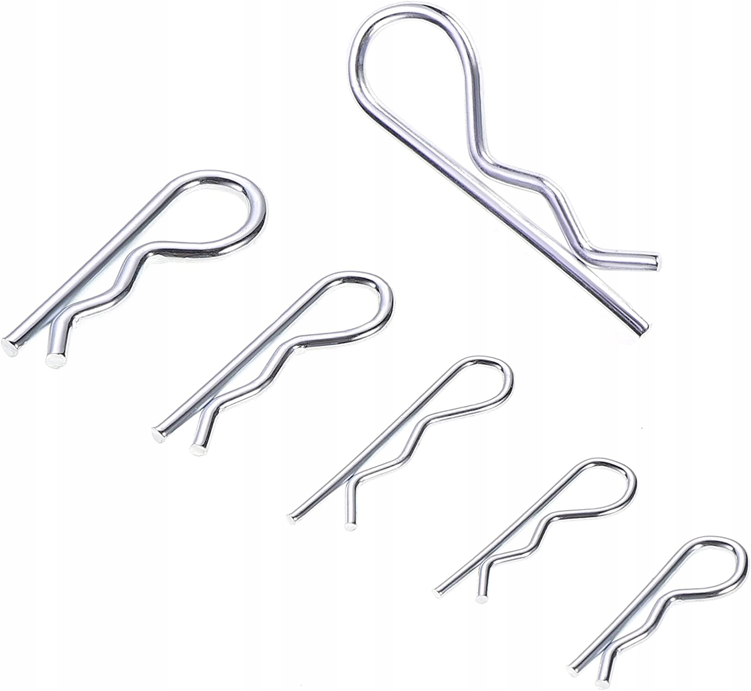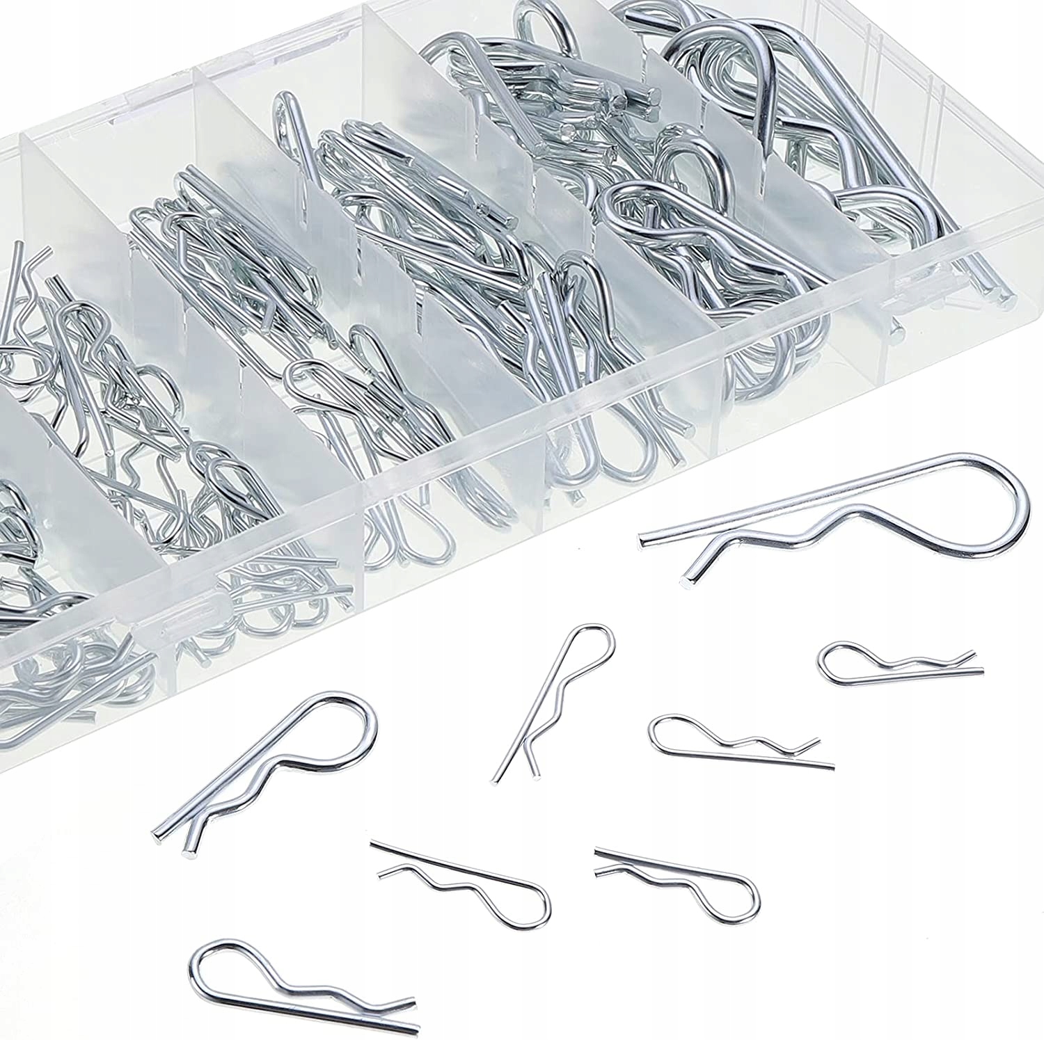 Набір пружинних шплінтів. Використовуються для захисту елементів на валах, осях або цапфах від ковзання. 6 розмірів. Упаковано в пластиковий органайзер із відділеннями для зручного зберігання.