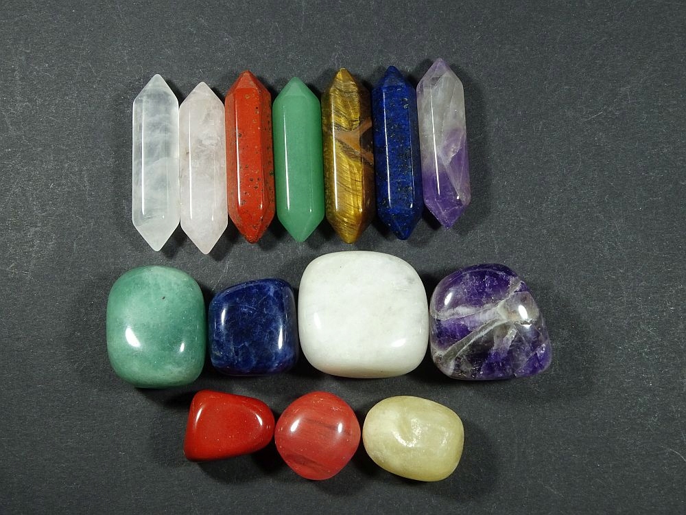 Набір включає - двостороннє - тигрове око, червону яшму, авантюрин, лазурит, аметист і гірський кришталь.