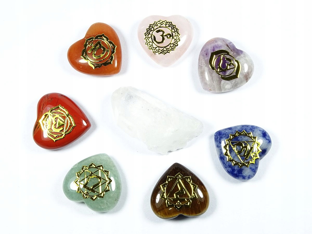 Набір 7 шліфувальних та полірованих каменів (форма серця), плюс гірський криштал, який закінчився природним косою. /P> Mountain Crystal, Amethyst, Red Jasper, Carneol, Lapis Lazuli, Pink Quartz, Aventuryn та Tiger.