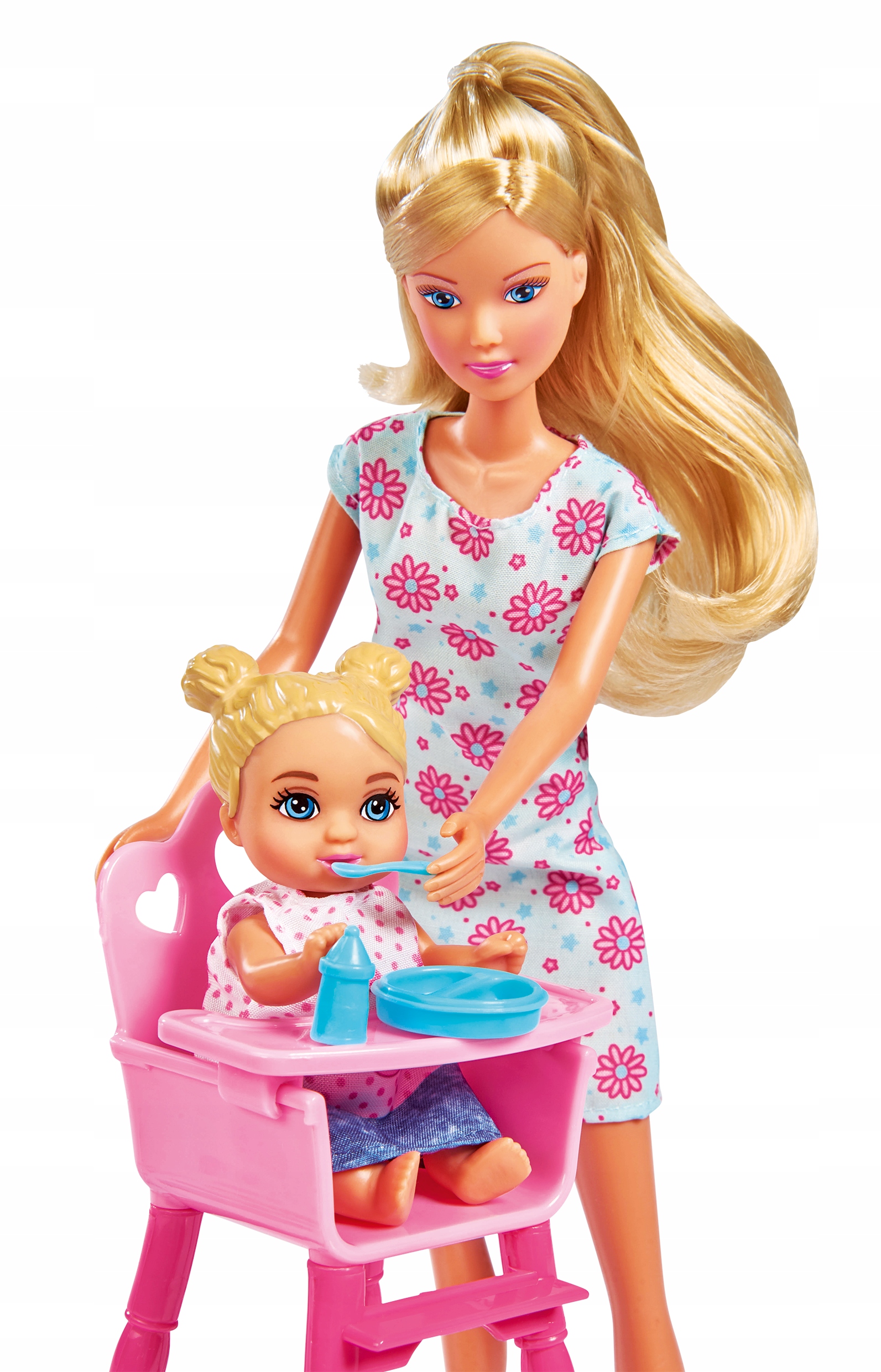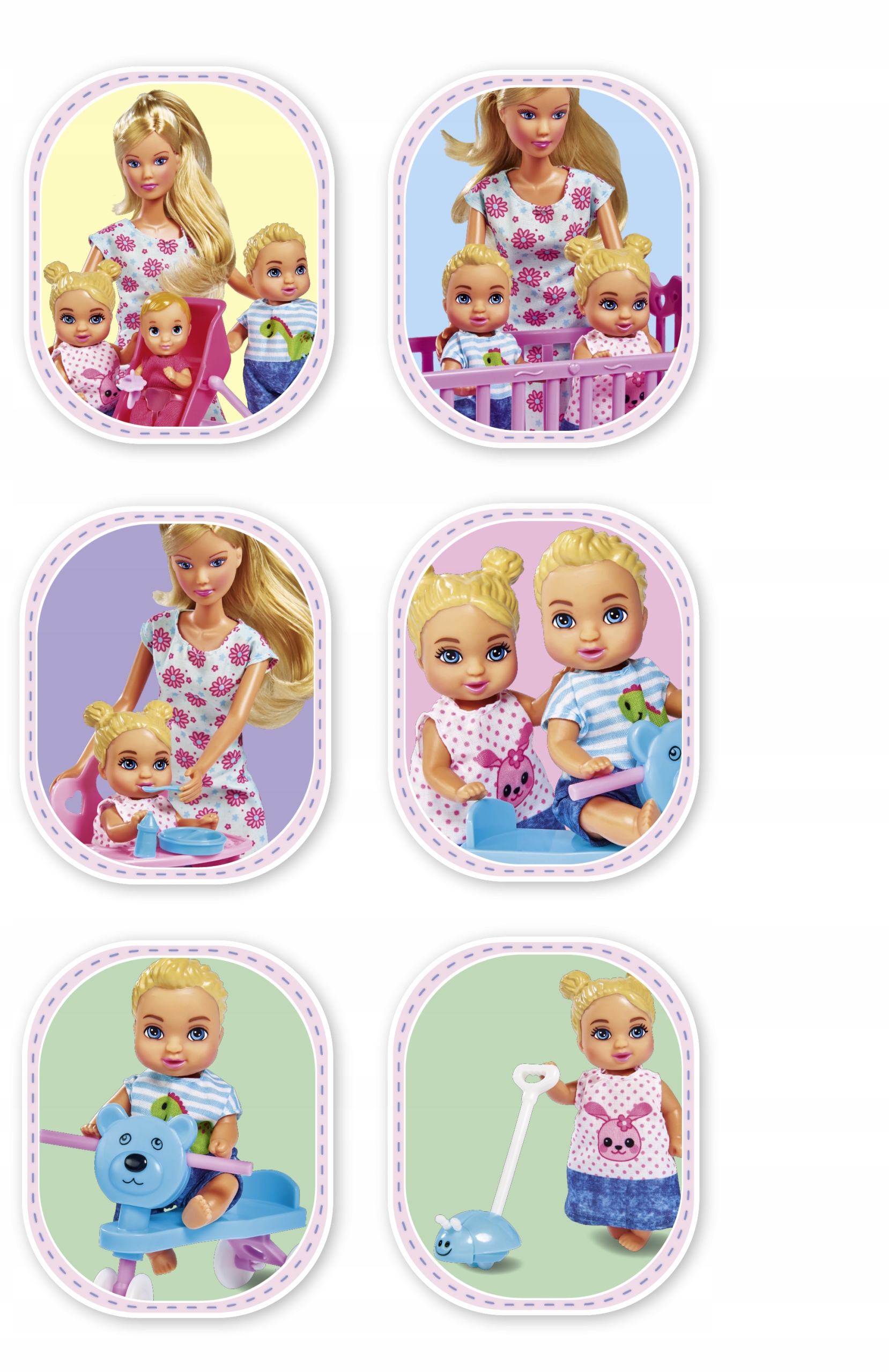 Штеффі має трьох маленьких дітей і з ними багато працює. Дітей потрібно нагодувати, укласти спати і погуляти, а заодно урізноманітнити вільний час, щоб вони не нудьгували. Мама малюків добре підготувалася до цього, в комплект входить все необхідне: ліжечко, стільчик для годування, гондола 2 в 1 + коляска, люлька, велосипед, мишка-штовхач, набір для годування. , напої, соска, прорізувачі та іграшки. Стеффі виглядає квітучою, як мати, одягнена в блакитну спідницю, білу блузку, рожеве болеро та рожеві туфлі на високих підборах. Ніжний макіяж ідеально поєднується з довгим блискучим світлим волоссям.