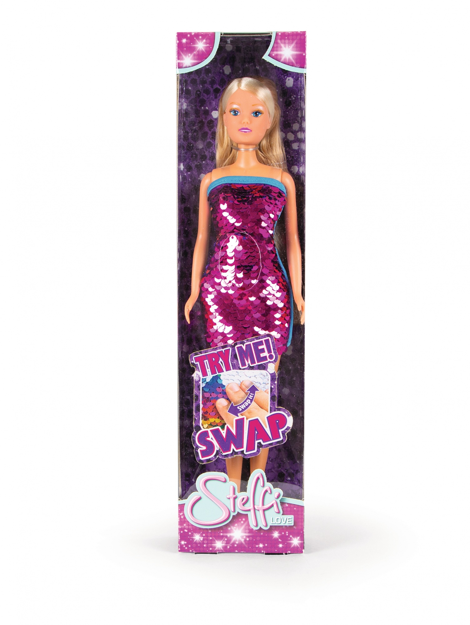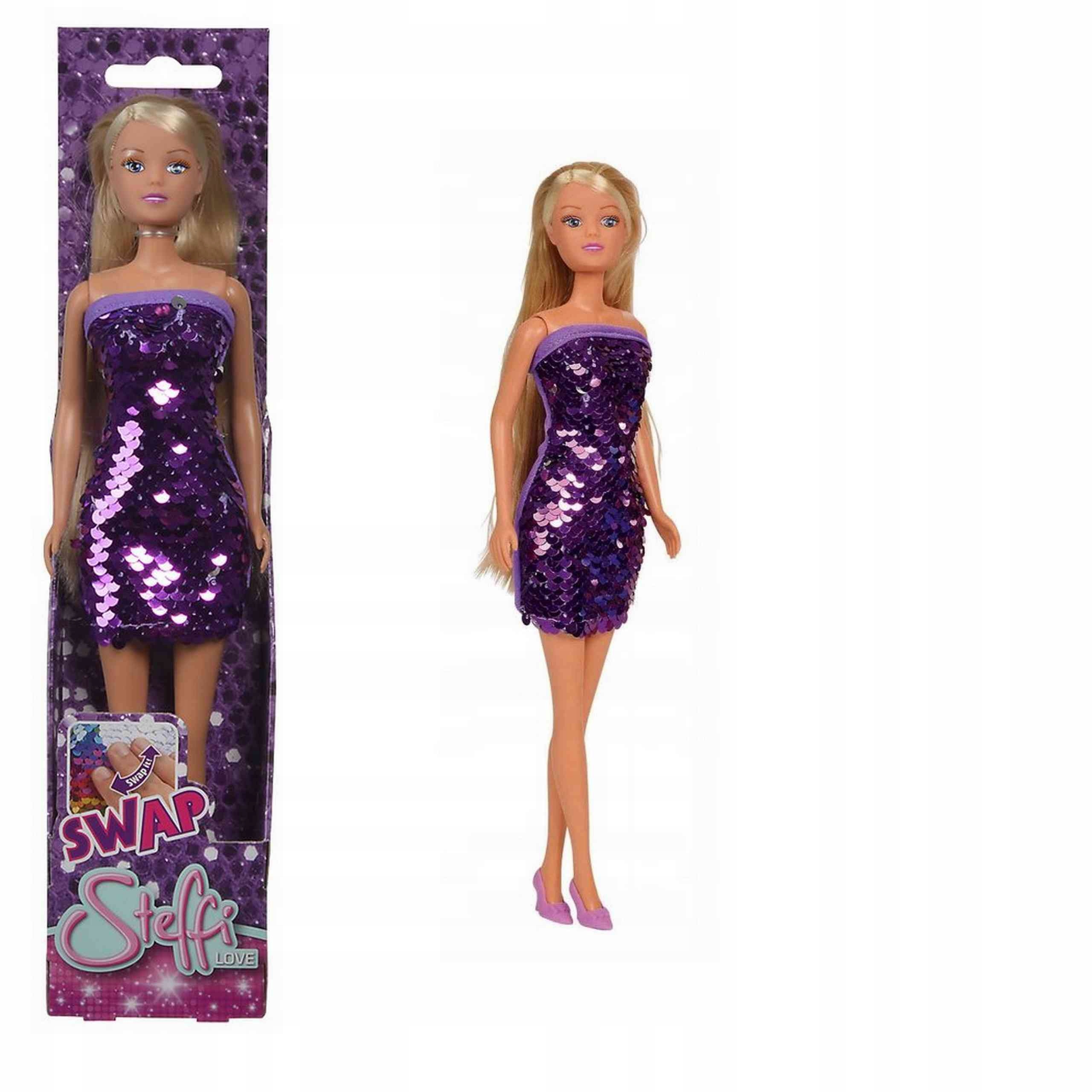 Лялька Штеффі Лав у сукні з паєтками, яка змінює колір, коли блискітки перевертаються, доступна в сукнях у 4 варіантах кольору: фіолетовий змінюється на сріблястий і навпаки, синій змінюється на золотий і навпаки, рожевий змінюється на синій і навпаки навпаки, зміна срібного на кольорове та навпаки (продається окремо, за наявності).