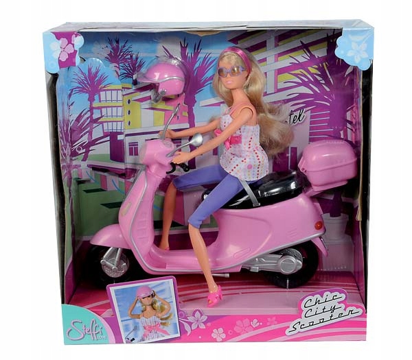 Набір включає: - Лялька Штеффі, - рожевий скутер з багажником, що відкривається, - шолом відповідного кольору, - і модні сонцезахисні окуляри.